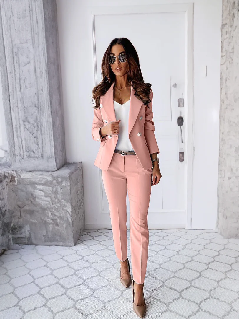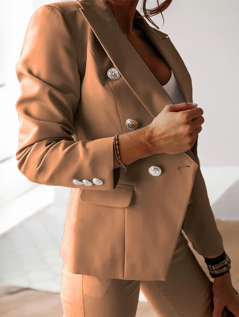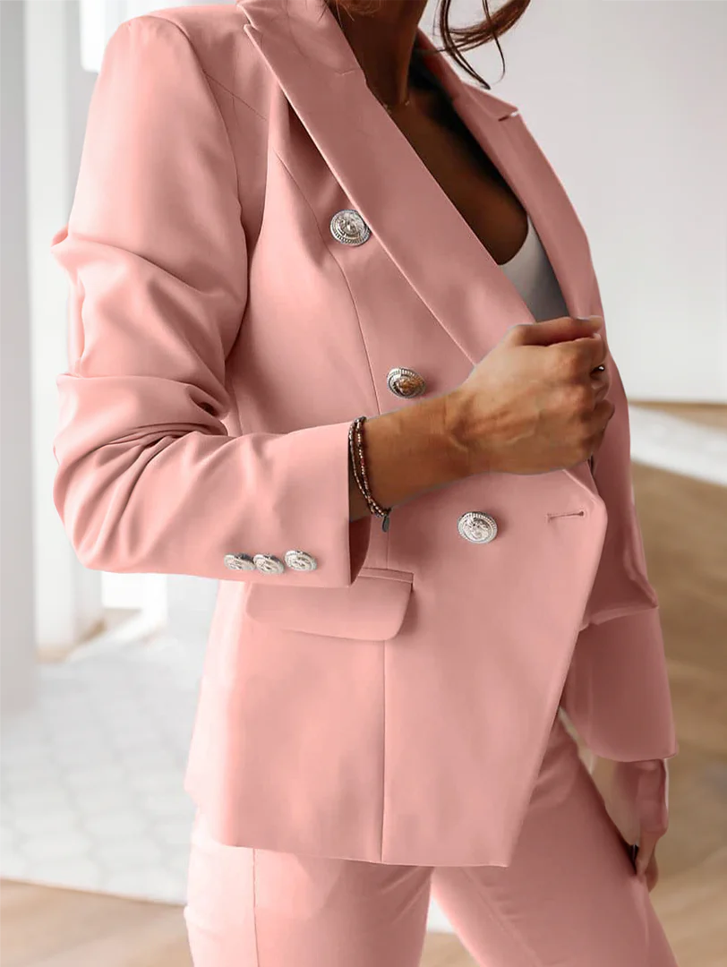 Tailleur elegante con giacca doppiopetto tre bottoni su polsino