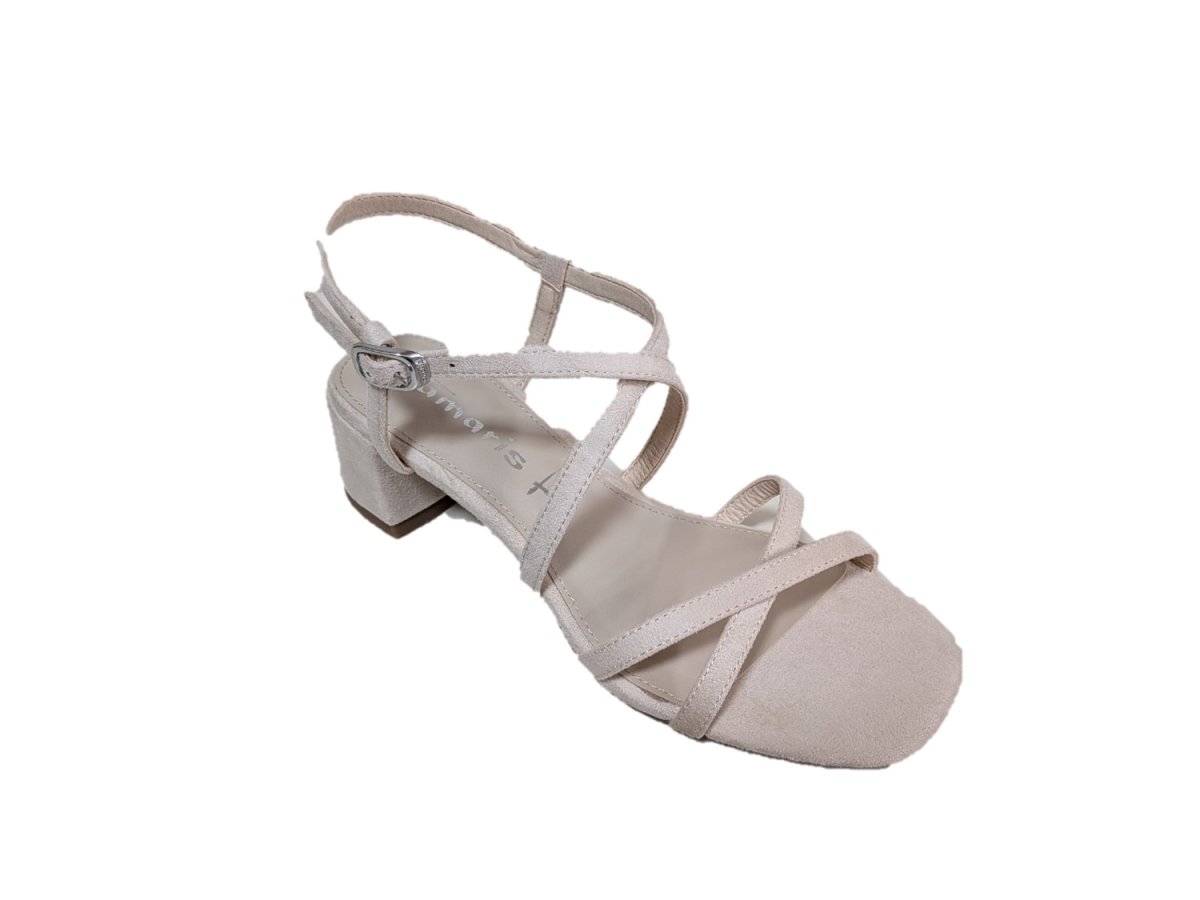 Sandalo con tomaia in sintetico, tacco 5cm, suola in sintetico, allacciatura con la fibbia.