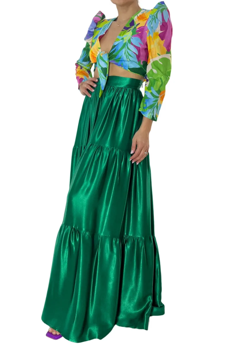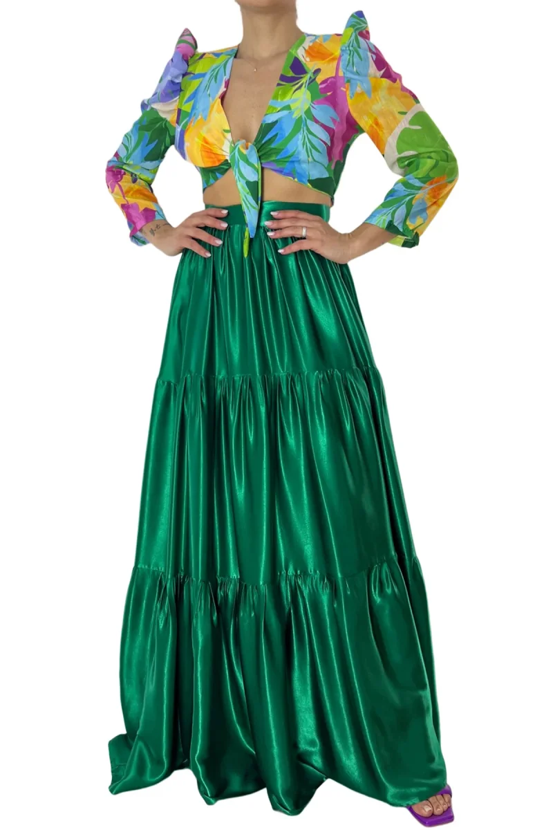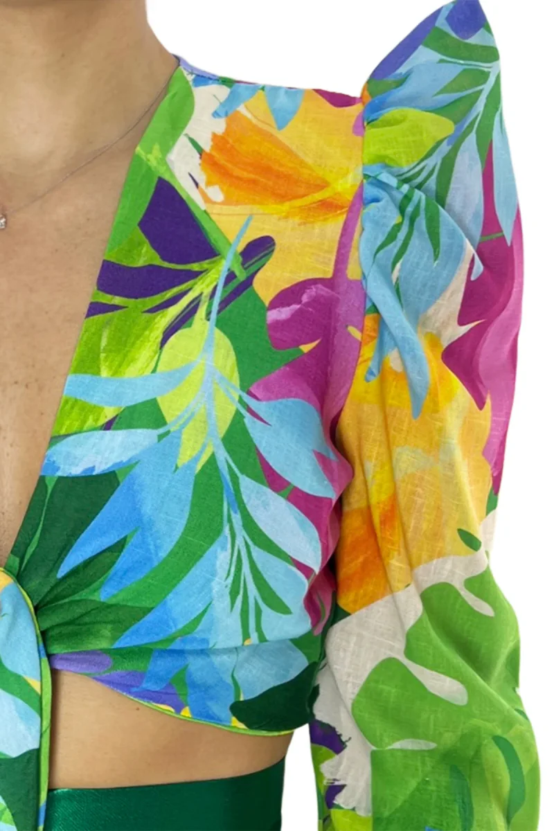 Top donna corto in cotone lino con spallina a sbuffo manica lunga scollo a V e chiusura nodo