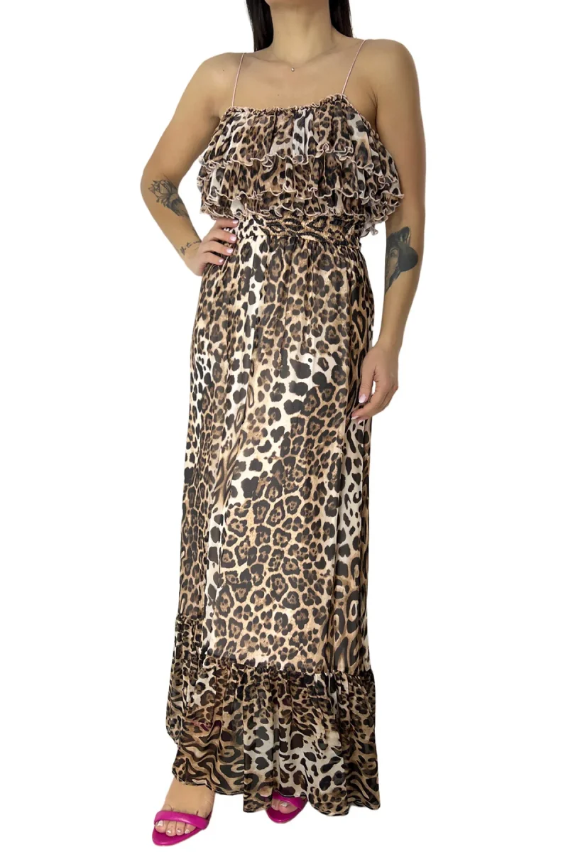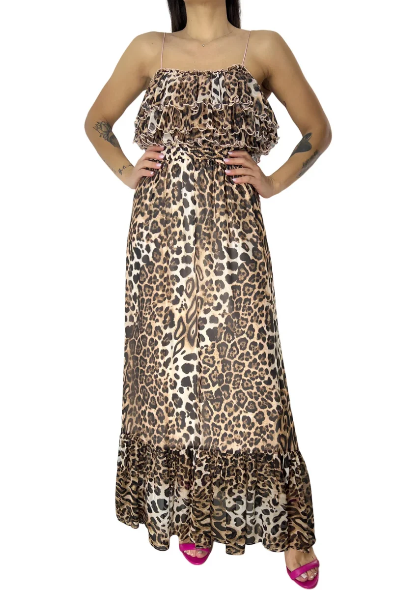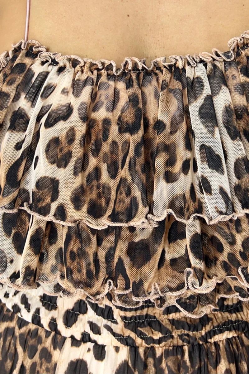 Top donna corto in tulle con balze bretella sottile elastica stampa animalier