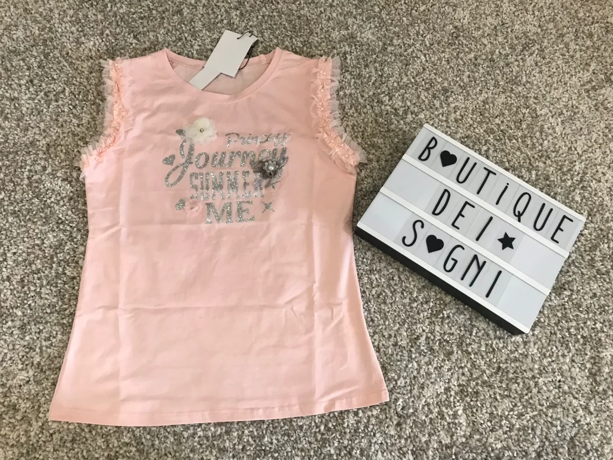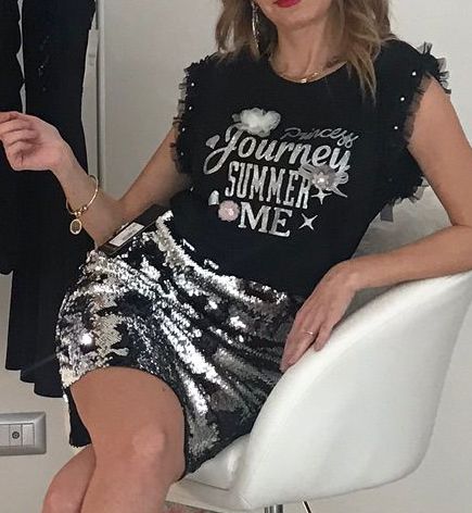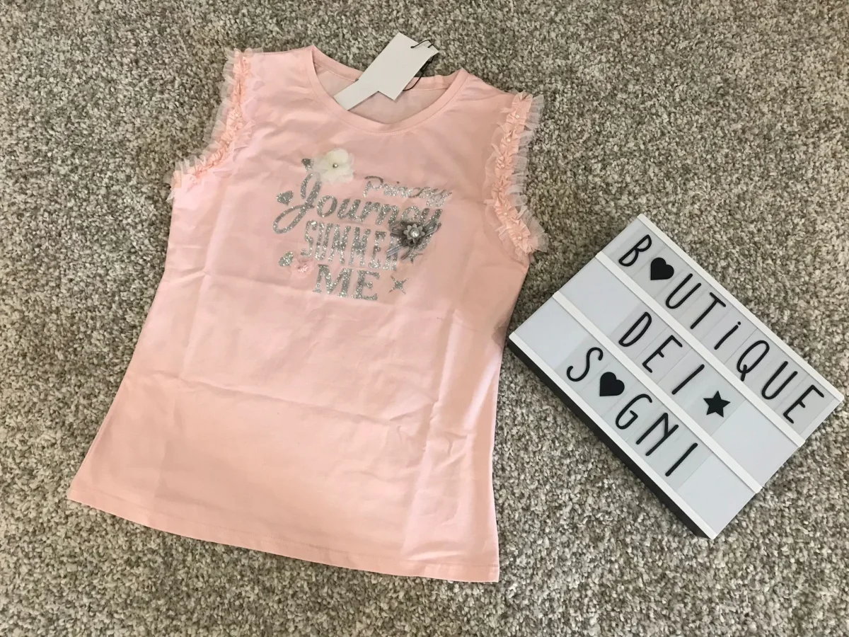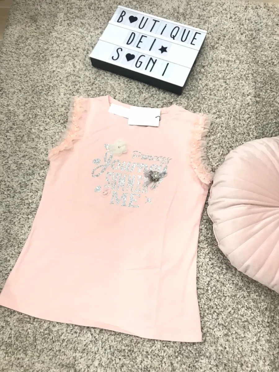 Top giromanica con rouches in tulle e stampa in glitter impreziosita da perlina e fiocchetti. Per un look glamour e chic.