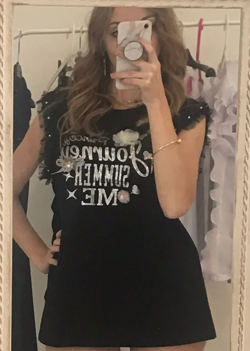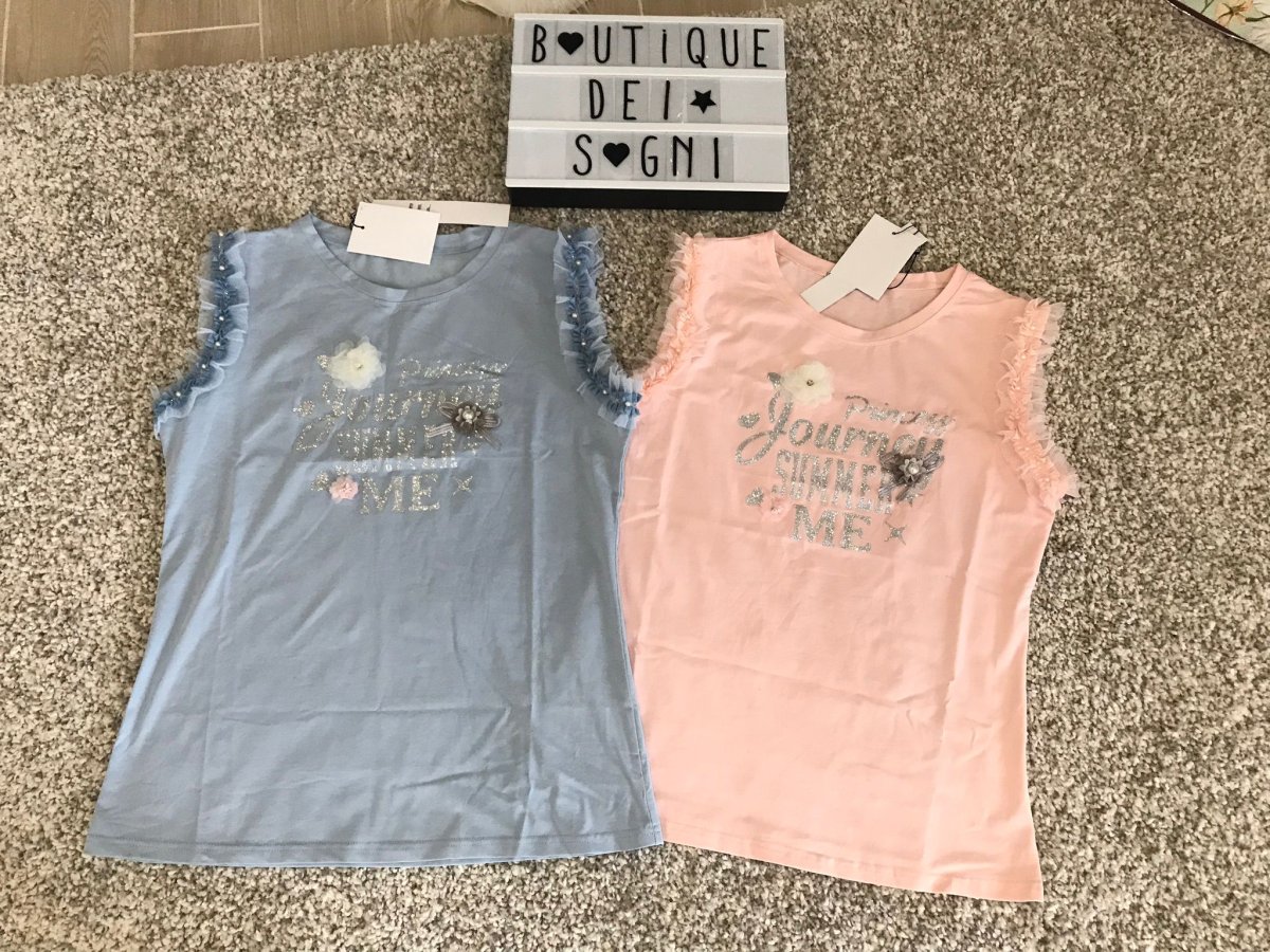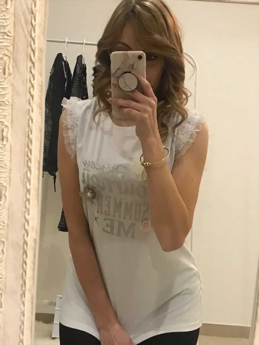 Top giromanica con rouches in tulle e stampa in glitter impreziosita da perlina e fiocchetti. Per un look glamour e chic.