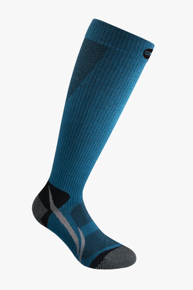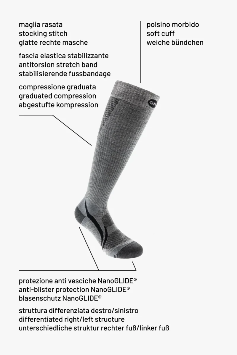 Progettata per i trekking di lunga durata con carichi pesanti. La presenza di lana merino garantisce una buona termoregolazione. L’impiego di filati tecnici elasticizzati la rendono resistente e durevole. La punta ed il tallone sono in NanoGLIDE®, per la sua funzione anti vesciche. È costruita ergonomicamente con punta asimmetrica per il piede destro e sinistro. La struttura elasticizzata ed avvolgente permette un’ottima stabilità sul piede e nella scarpa. La compressione moderata graduata agevola il ritorno venoso e contribuisce ad un più rapido ricambio di sangue ossigenato riducendo la sensazione di pesantezza.