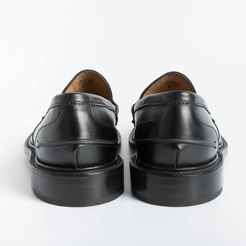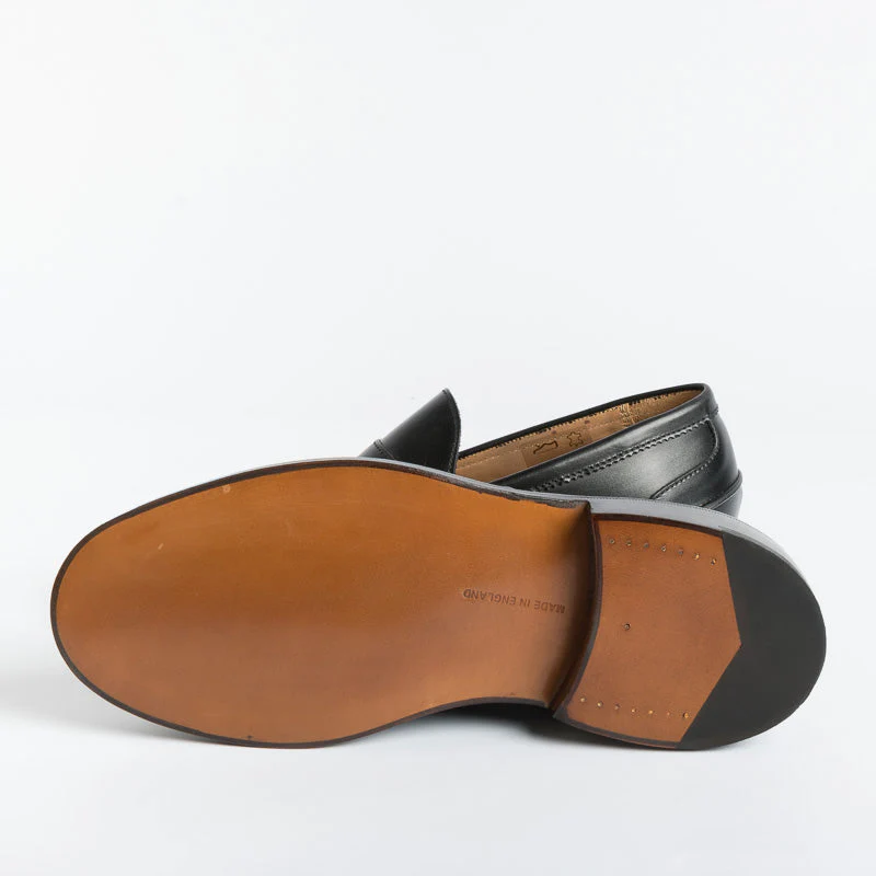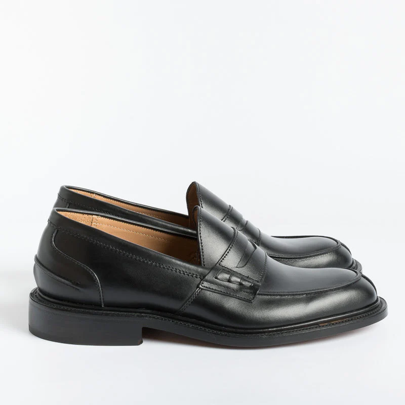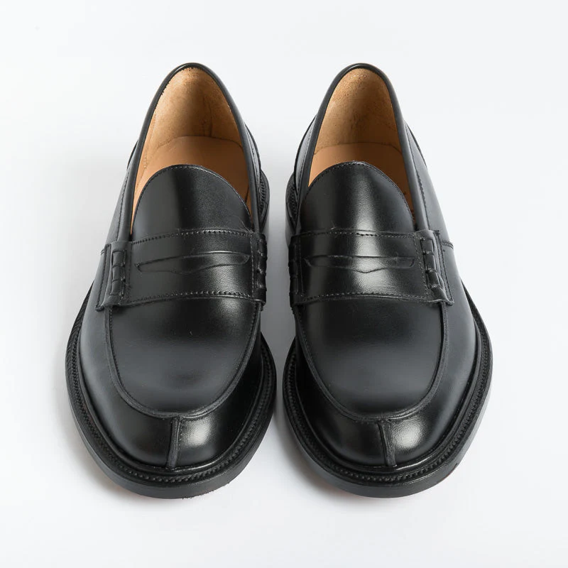 Mocassino classico di Tricker’s realizzato in pelle di vitello liscio di colore nero, tomaia e fodera in pelle, cucitura goodyear e suola in cuoio