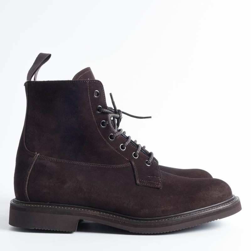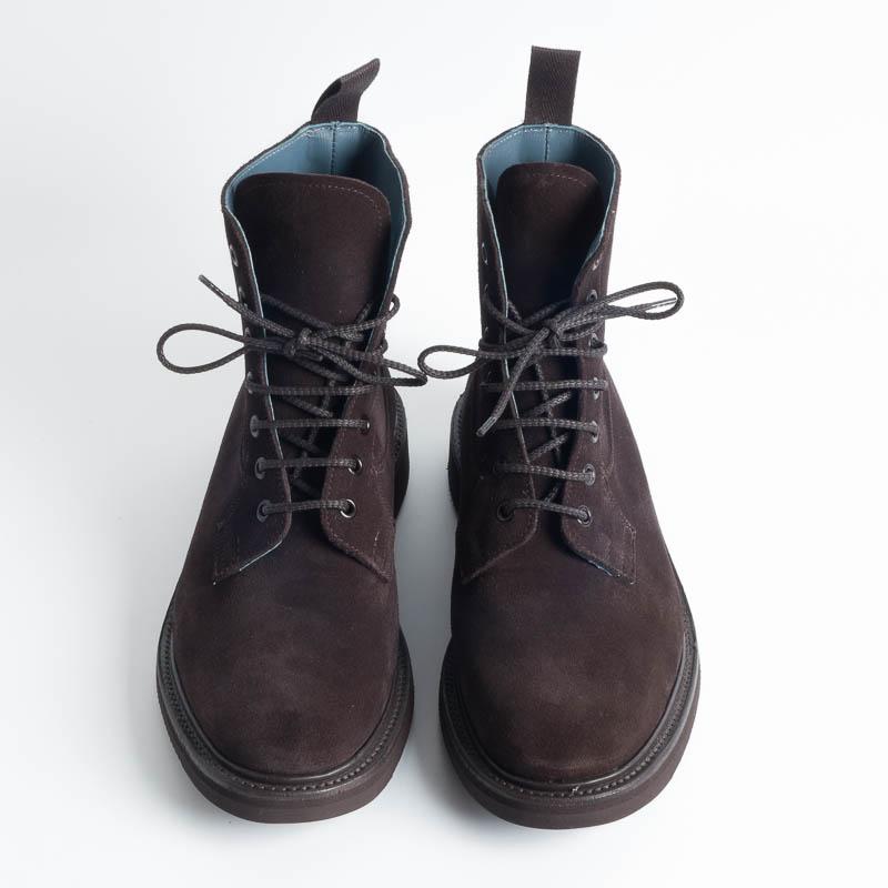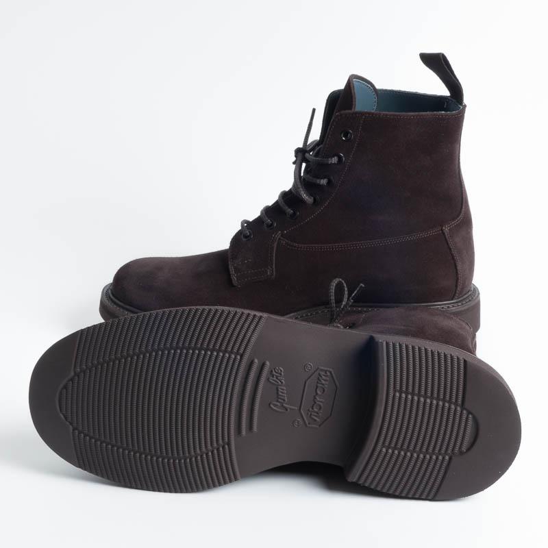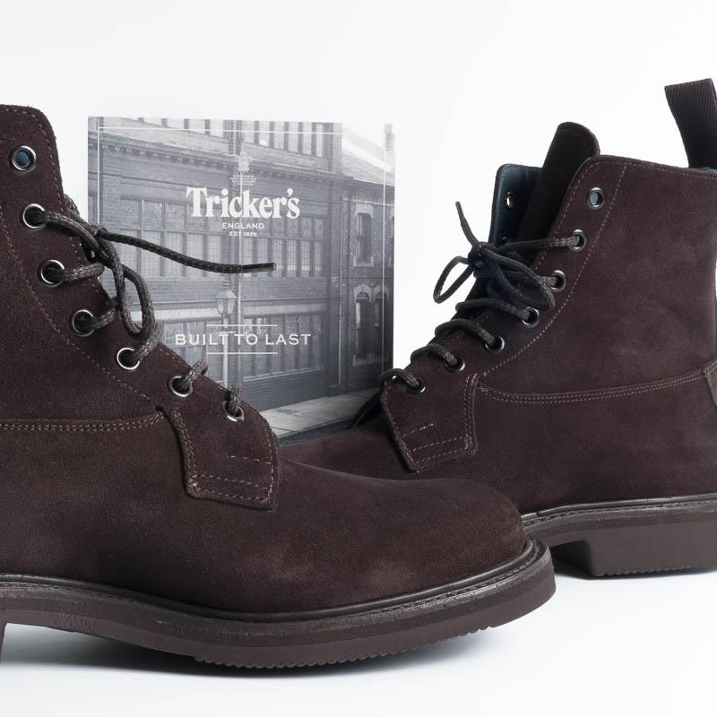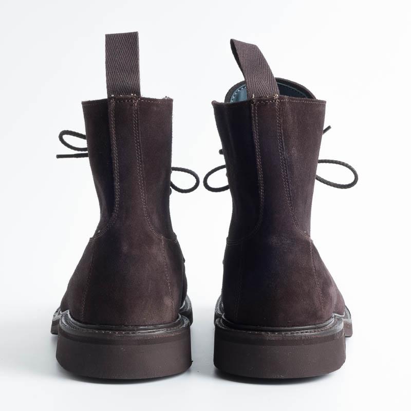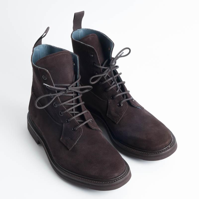 Polacco allacciato liscio di Tricker’s realizzato in camoscio di colore testa di moro. Lavorazione artigianale e cucitura Goodyear, fondo Vibram gumlight. Realizzato nel Regno Unito. Calzata regolare.