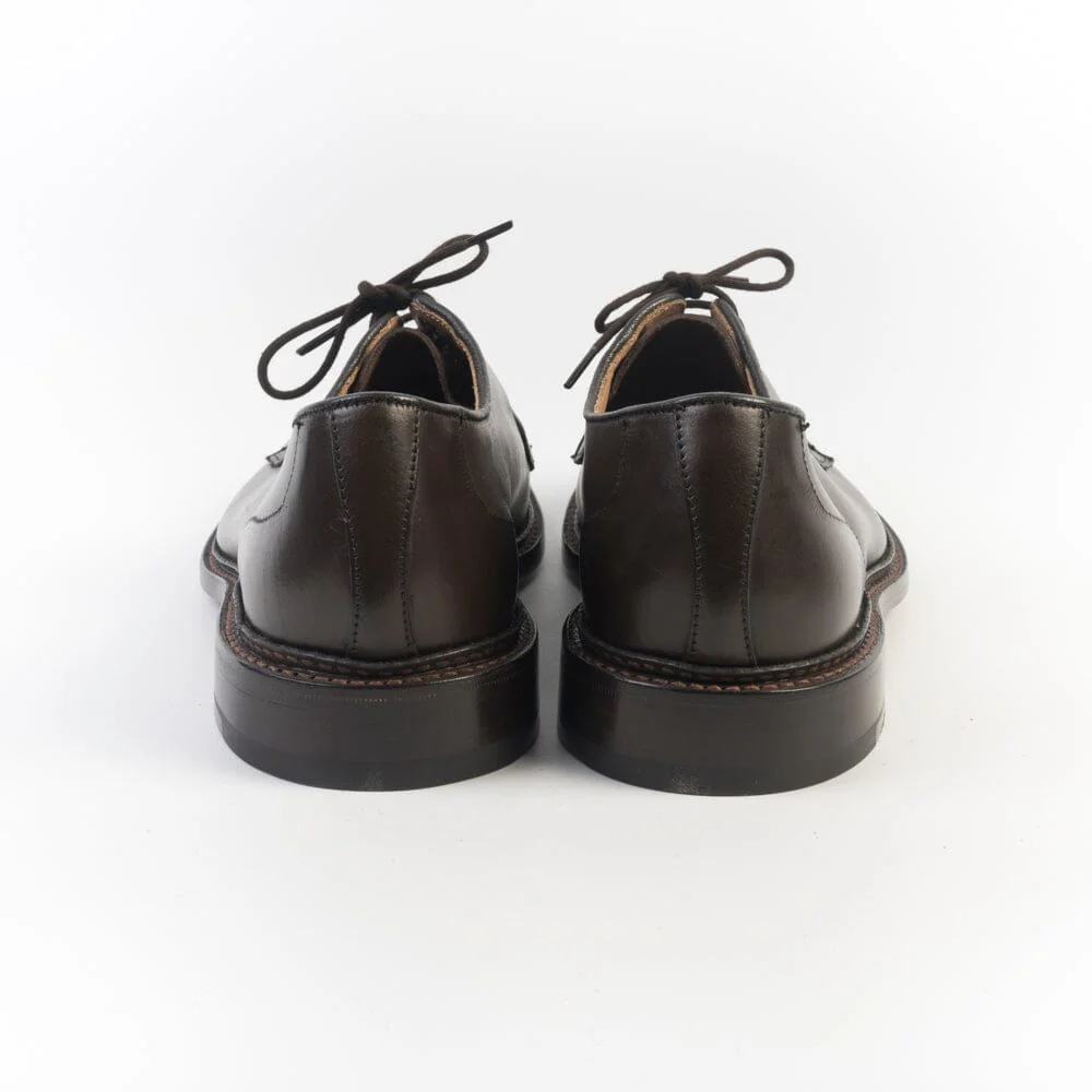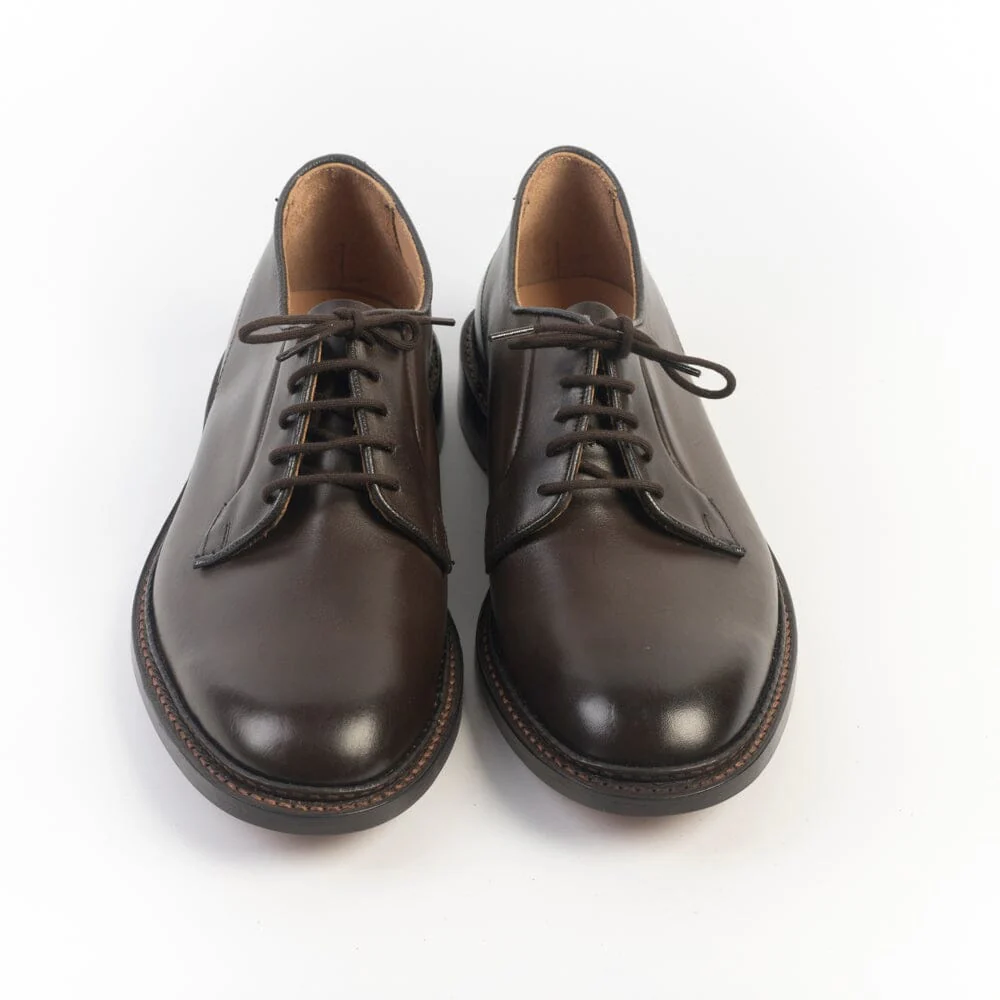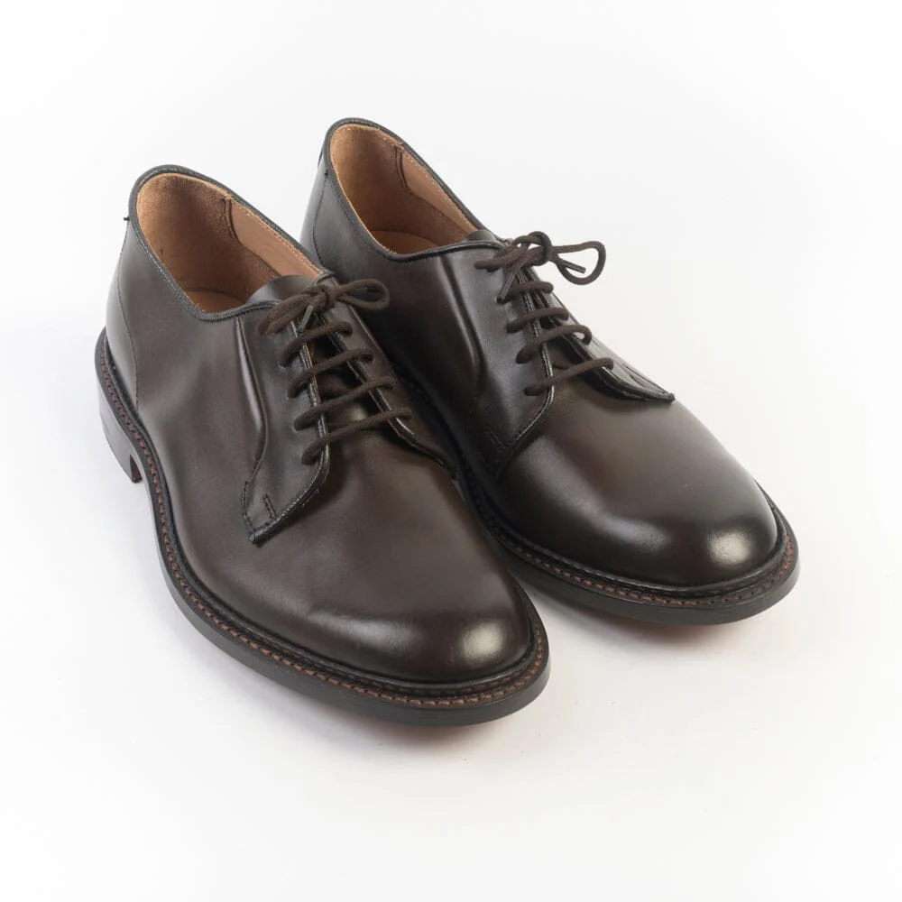 Derby di Tricker’s realizzato in pelle di vitello di colore testa di moro. Interno sfoderato cucitura Goodyear, fondo in cuoio. Cinque fori, lacci in cotone in nuance. Lavorazione artigianale.