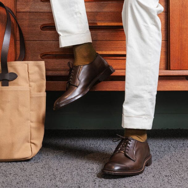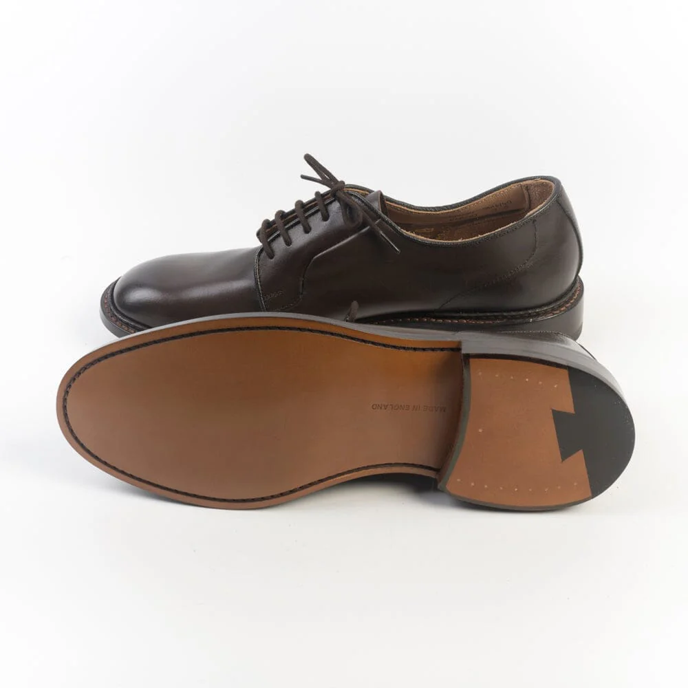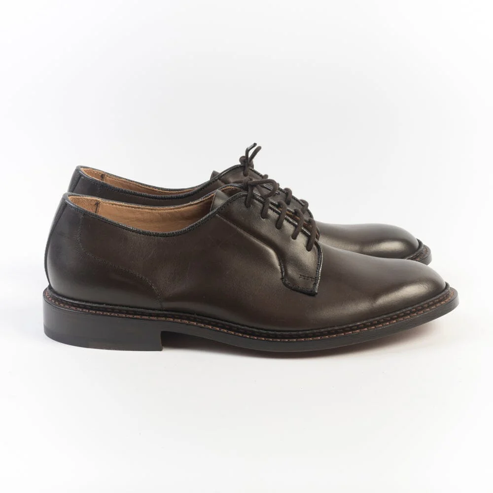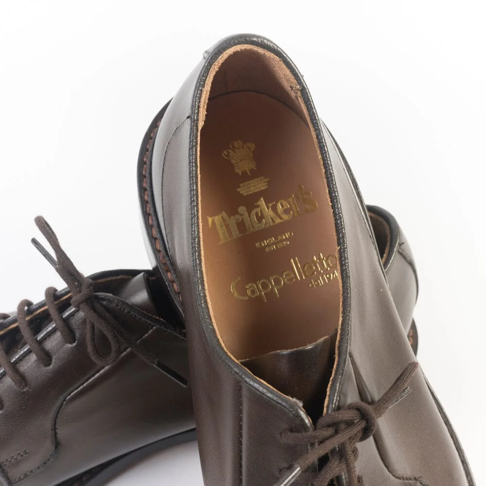 Derby di Tricker’s realizzato in pelle di vitello di colore testa di moro. Interno sfoderato cucitura Goodyear, fondo in cuoio. Cinque fori, lacci in cotone in nuance. Lavorazione artigianale.