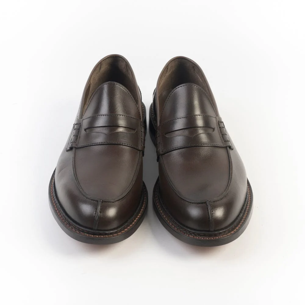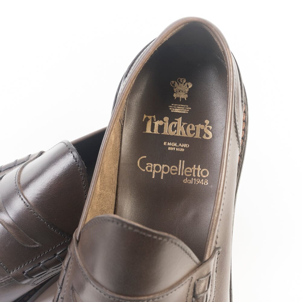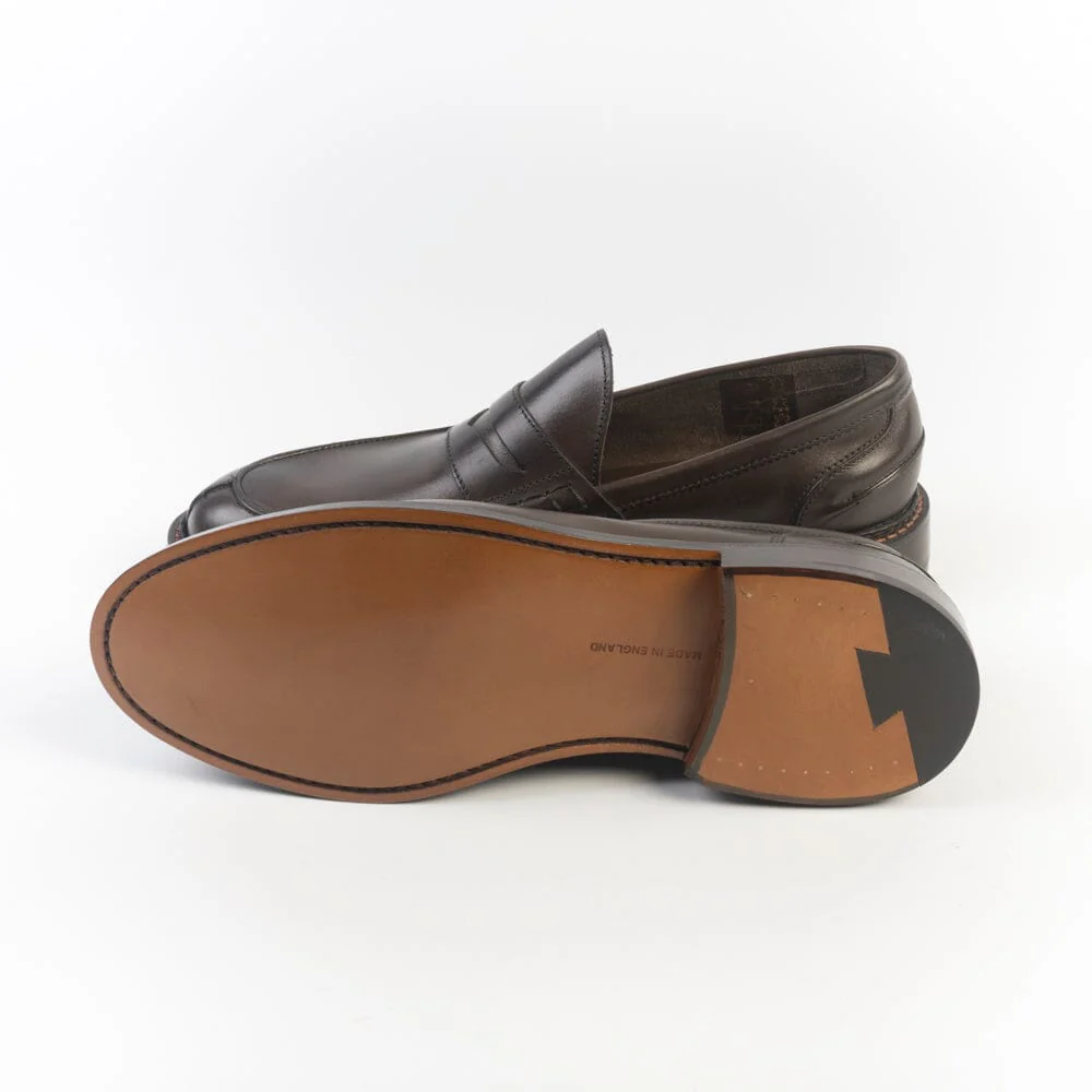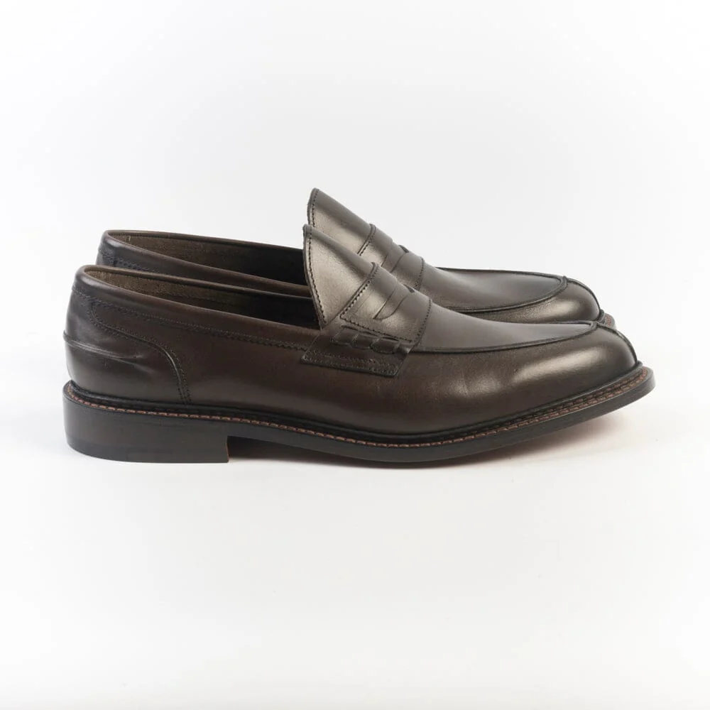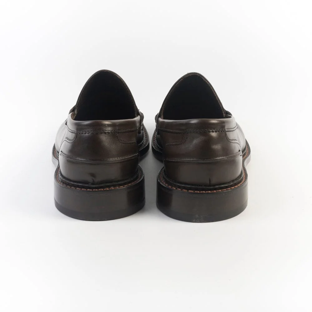 Mocassino classico di Tricker’s realizzzato in pelle di vitello liscio di colore marrone, interno sfoderato; cucitura goodyear e suola in cuoio. Lavorazione artigianale. Calzata regolare.