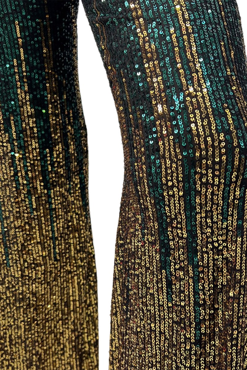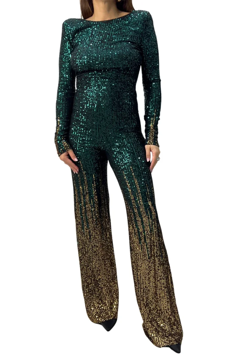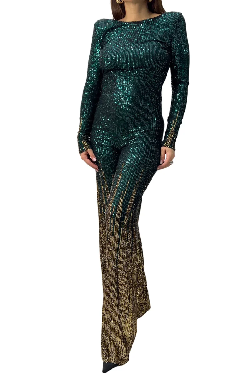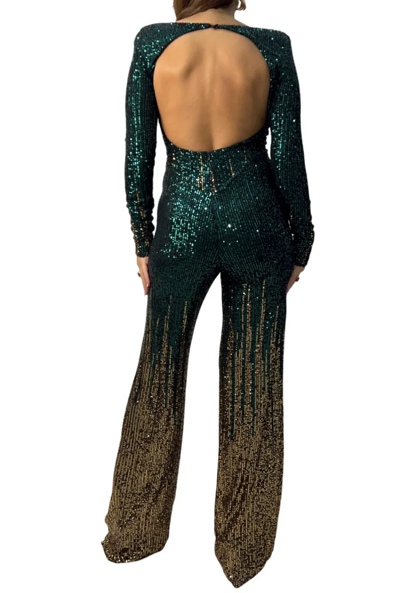 Tuta donna lunga in tessuto micro pailettes sfumate scollo alla schiena chiusura bottone collo