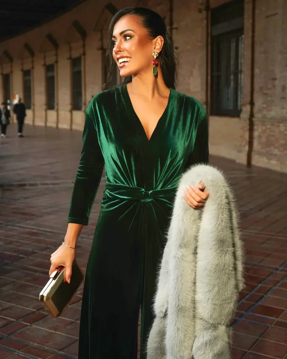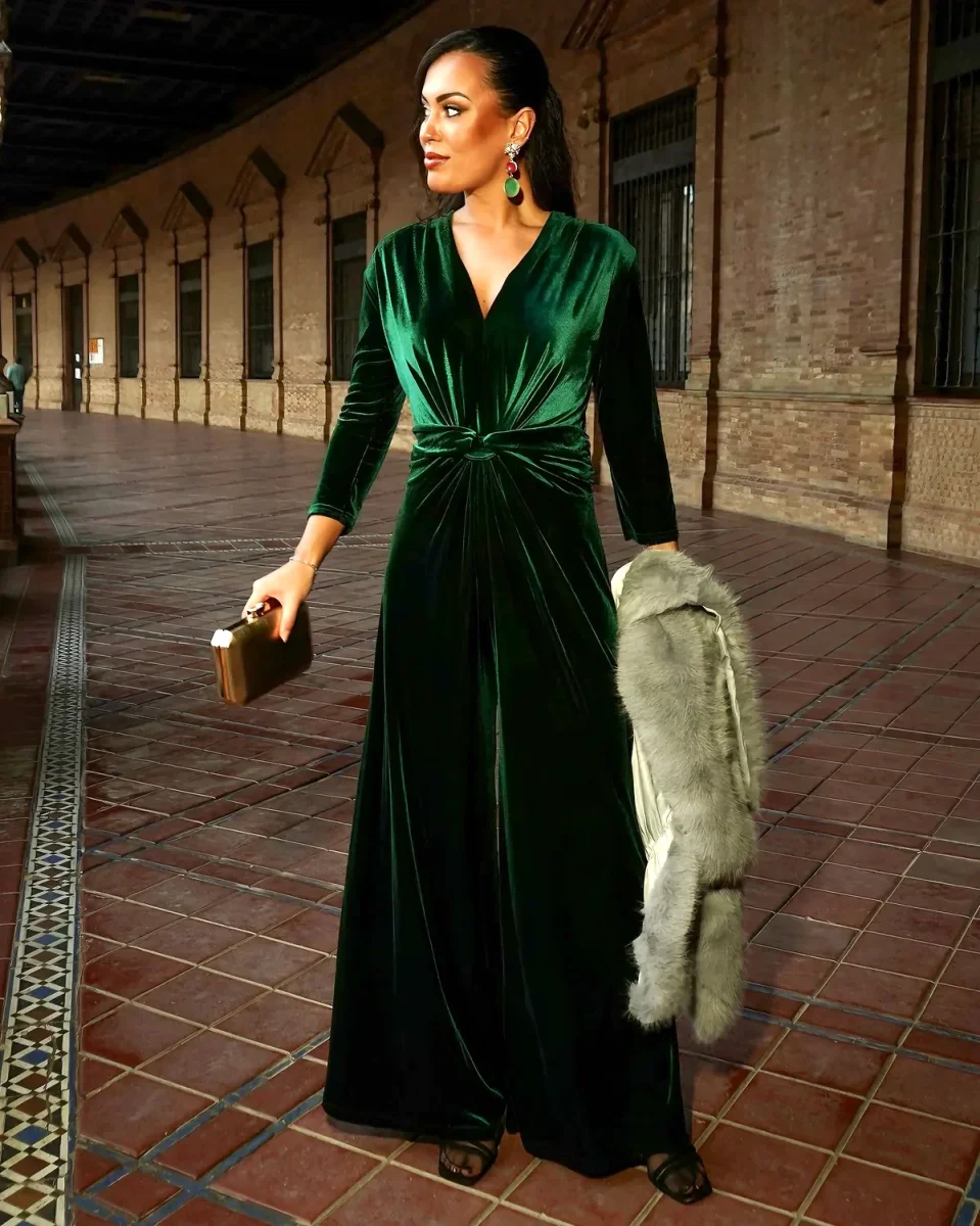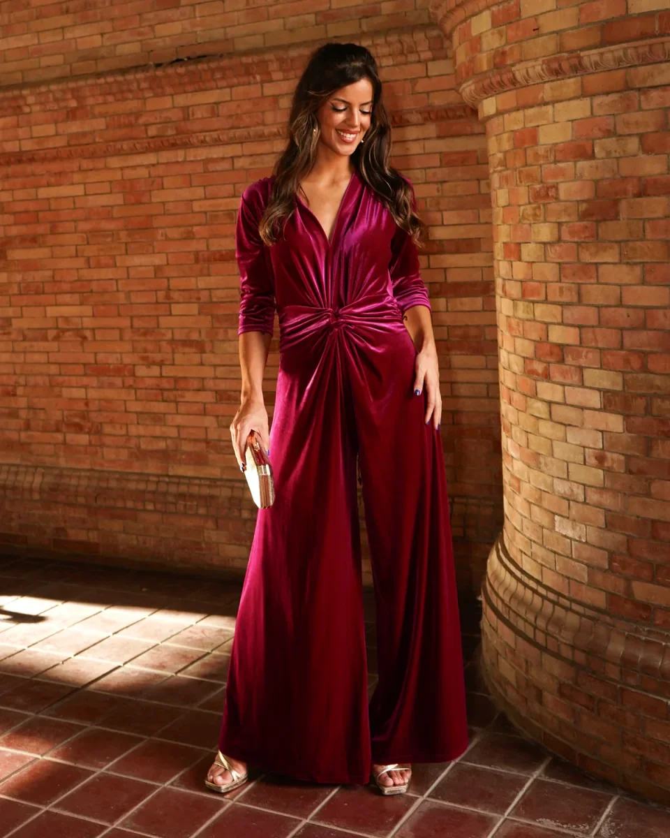 Tuta in velluto con scollo a V e nodo frontale, taglio palazzo. La tuta ha uno stile elegante e glamour, adatta per occasioni speciali, serate o eventi formali.