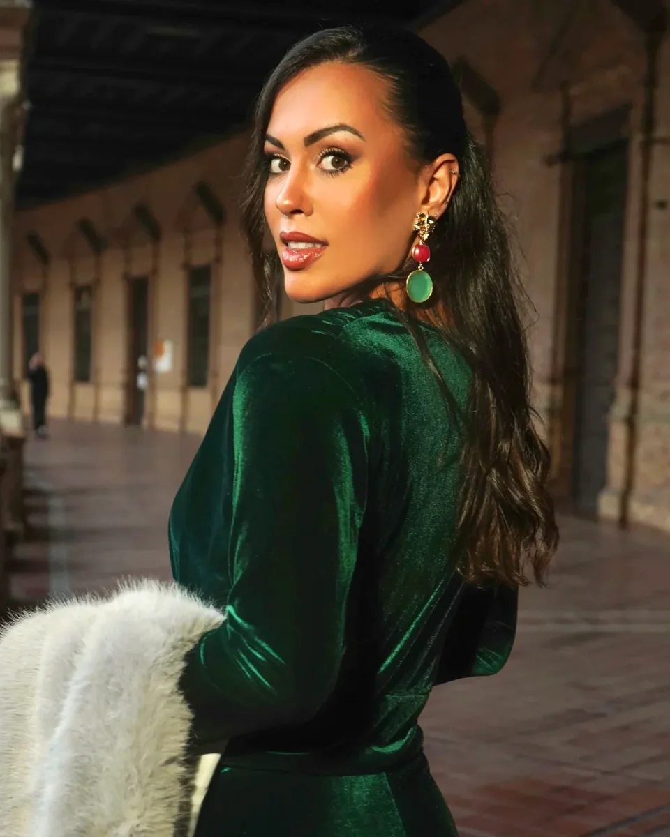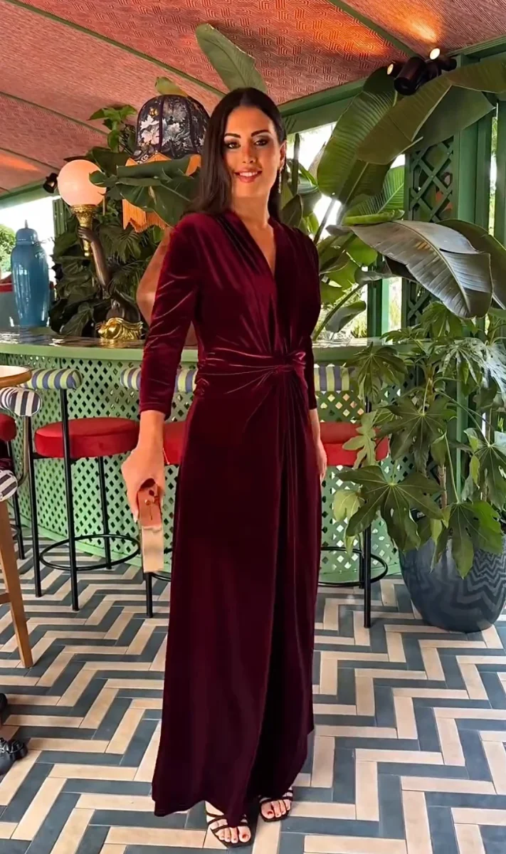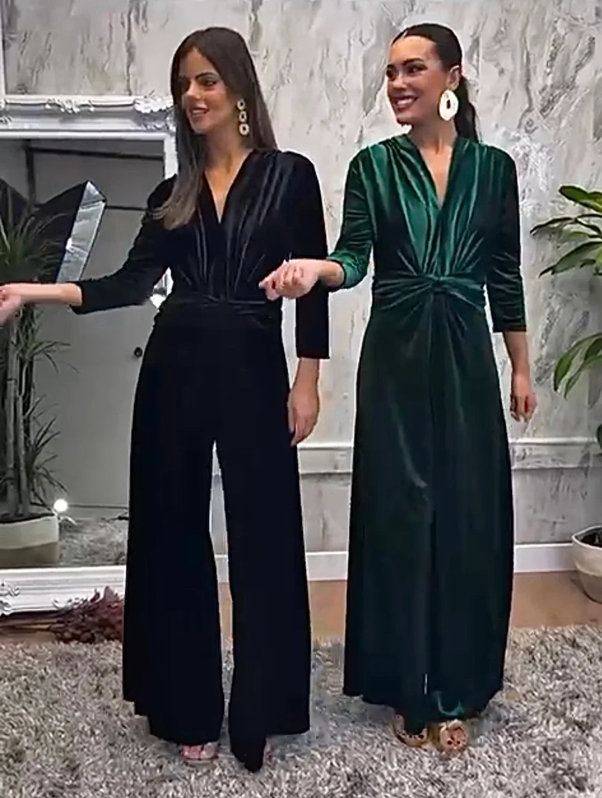 Tuta in velluto con scollo a V e nodo frontale, taglio palazzo. La tuta ha uno stile elegante e glamour, adatta per occasioni speciali, serate o eventi formali.