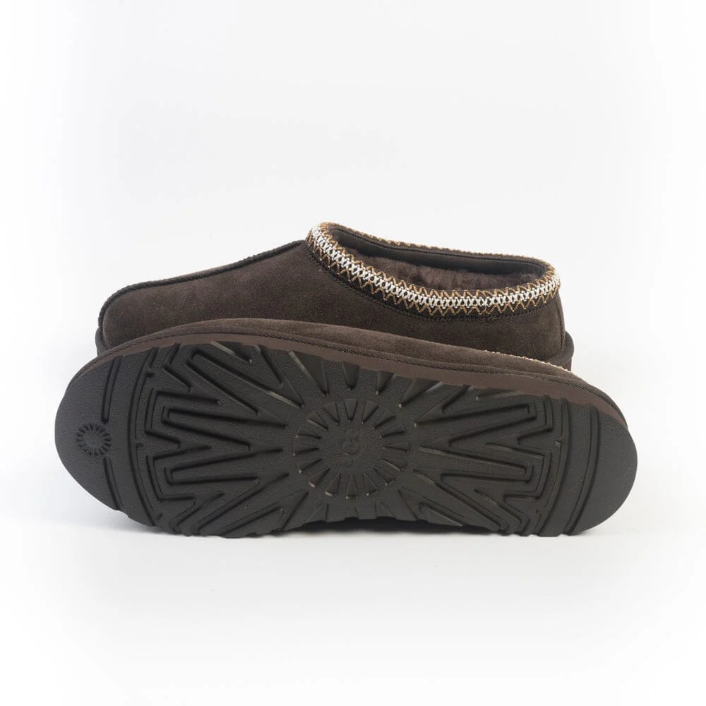 Ciabatta Tasman di UGG in montone colore marrone scuro con cuciture in contrasto sul bordo, di colore bianco. Fondo gomma.