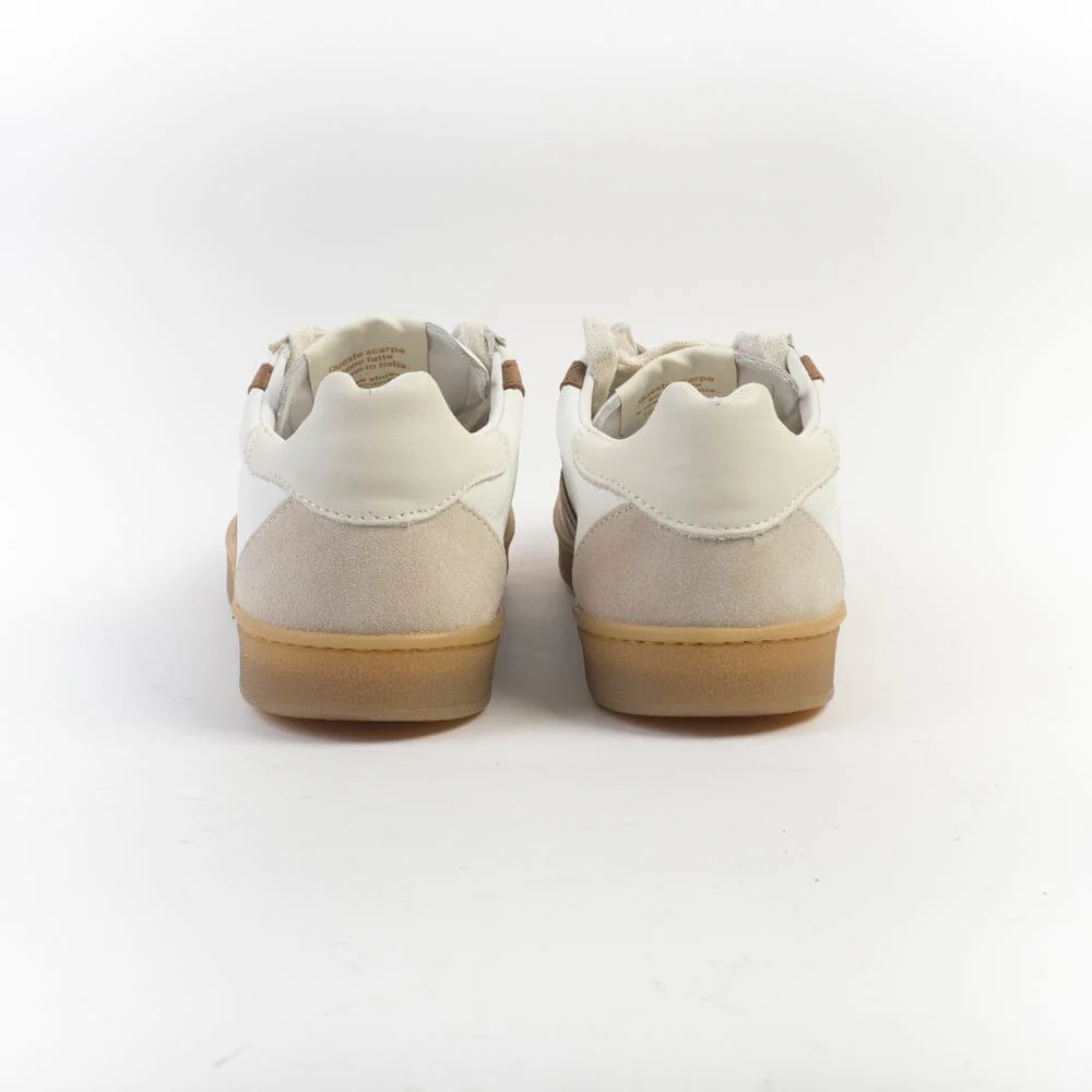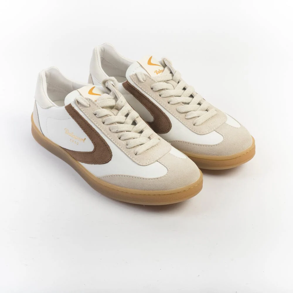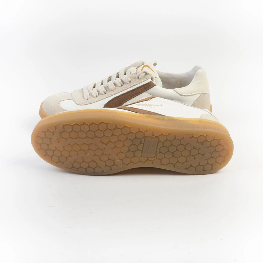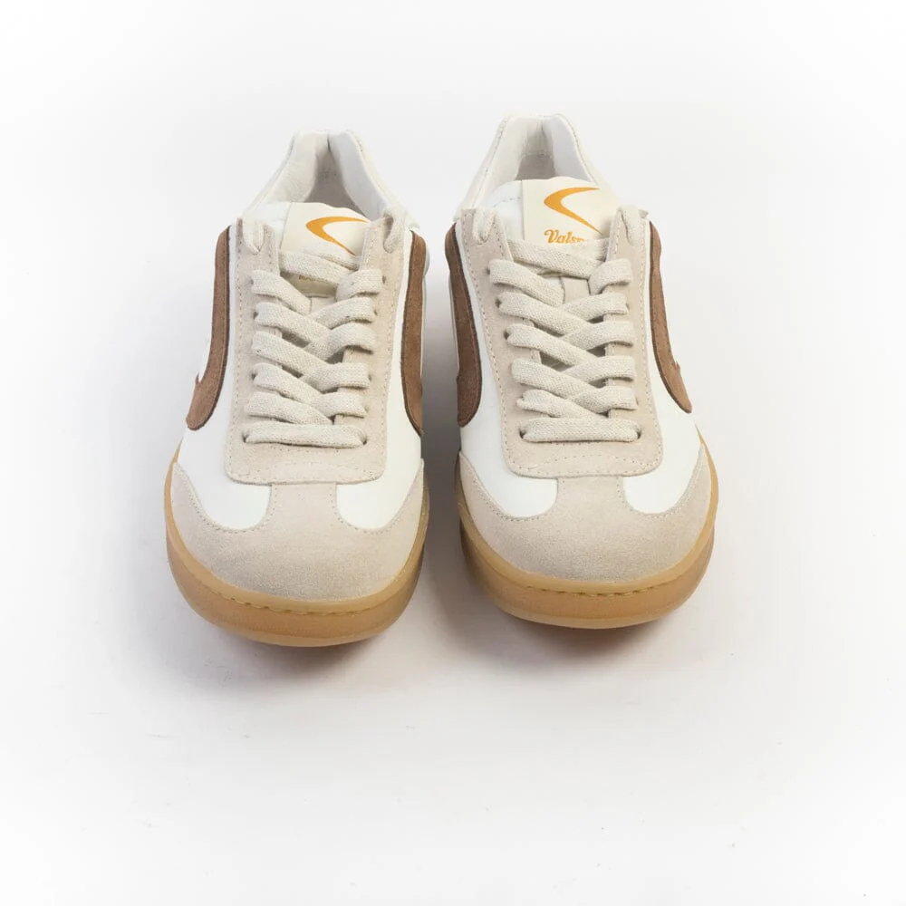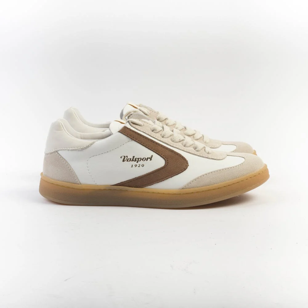 Sneakers Valsport modello Olimpia, realizzata in pelle di colore bianco, profili in camoscio di colore beige, boumerang in camoscio di colore tabacco. Logo del brand dorato impresso su lato esterno. Lacci di cotone di colore avorio. In dotazione sacchetto anti-polvere. Fondo a cassetta cucito in gomma naturale.
