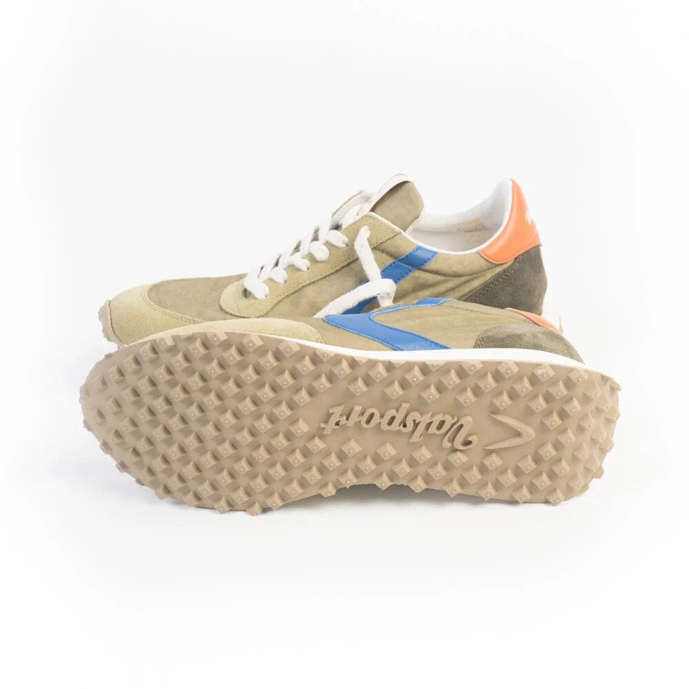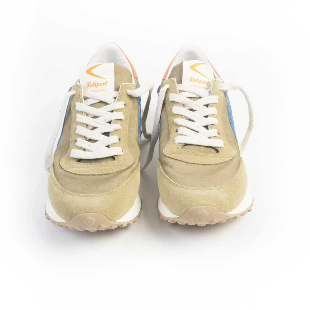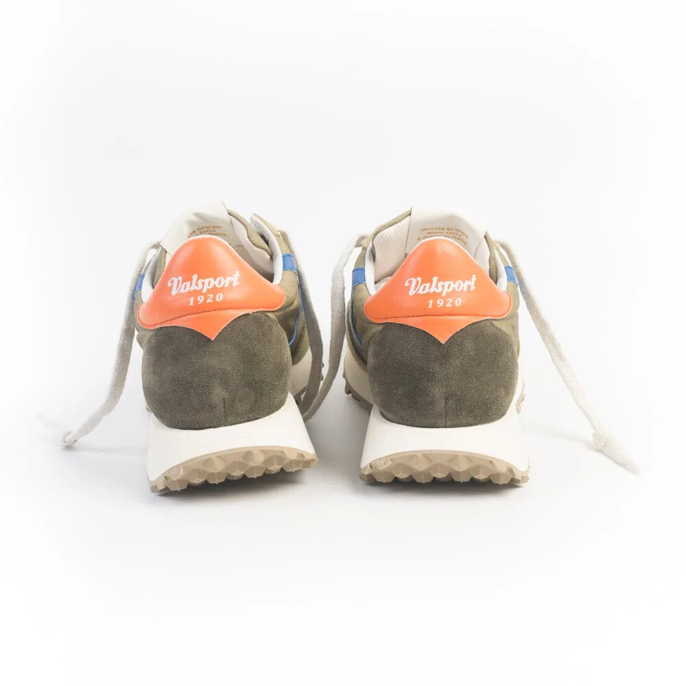 Sneakers Start di Valsport realizzate in tessuto tecnico e camoscio di colore verde cachi e verde militare. Boomerang laterale in pelle di colore blu elettrico. Dettaglio sul tallone in pelle di colore arancione con nome del brand di colore bianco. Lacci piatti di cotone di colore bianco sporco. Suola running in gomma, con grip elevato. Soletta interna in pelle, estraibile.