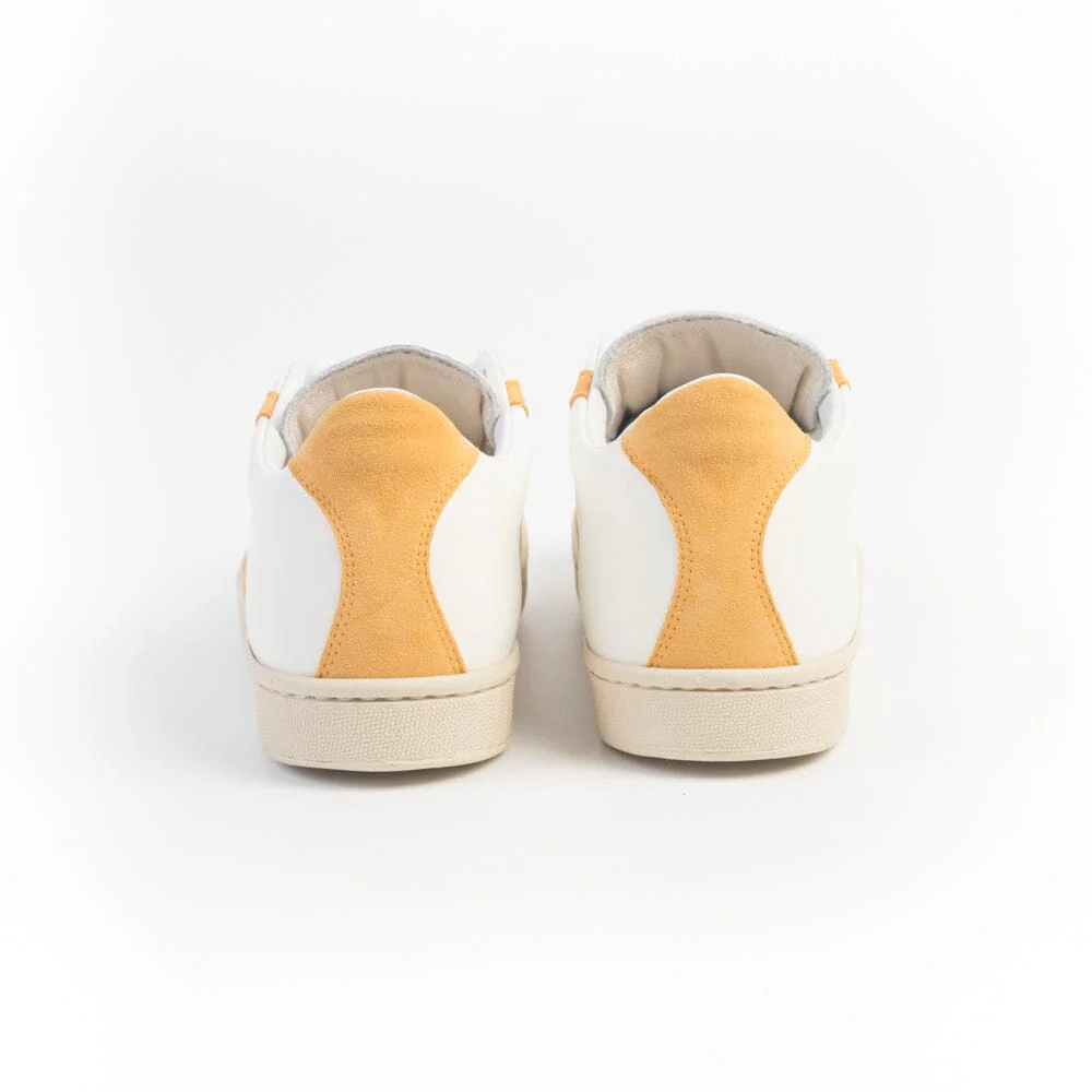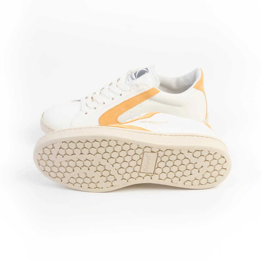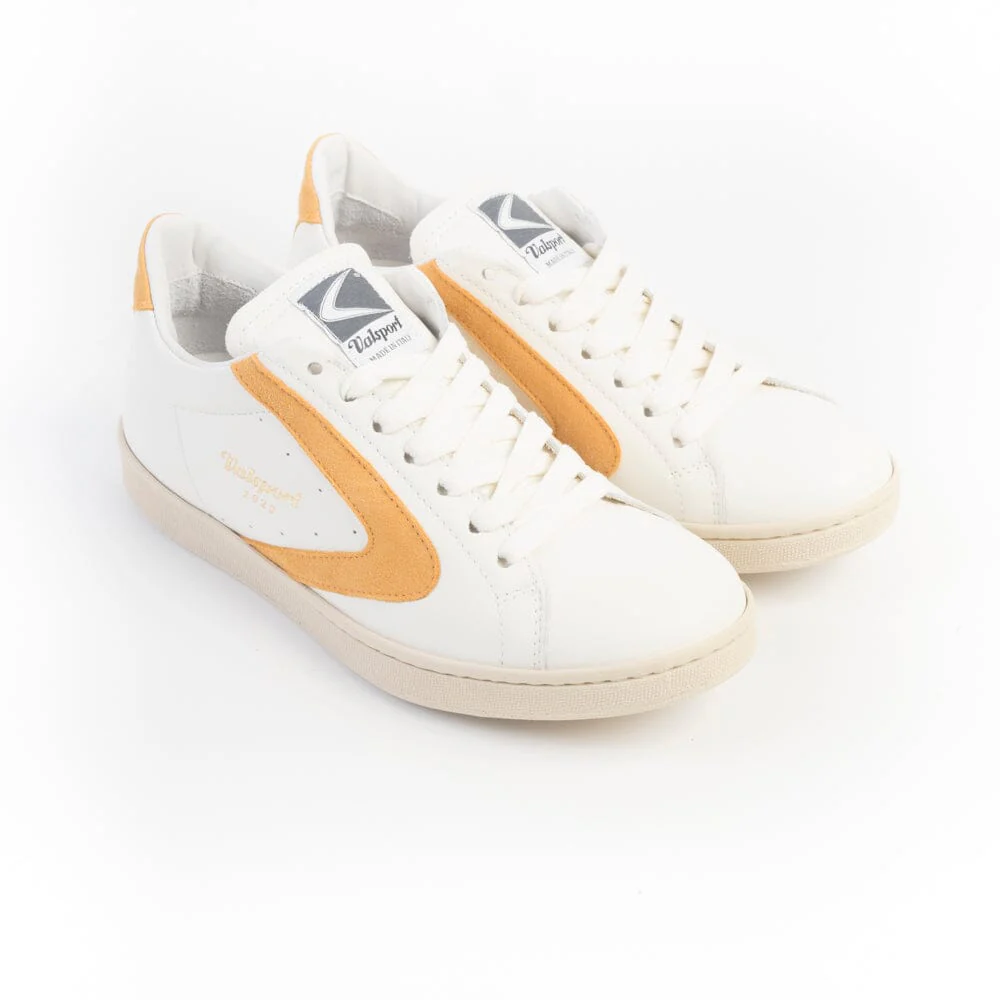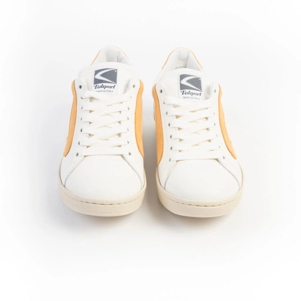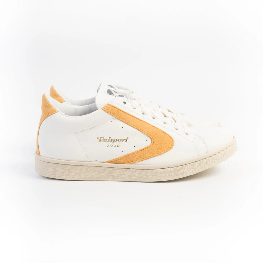 Sneakers Tournament di Valsport realizzate in pelle di colore avorio. Boomerang laterale e tallone in nabuk di colore giallo. Lacci piatti in cotone di colore bianco. Soletta interna in pelle estraibile di due centimetri. Suola in gomma modello tennis.