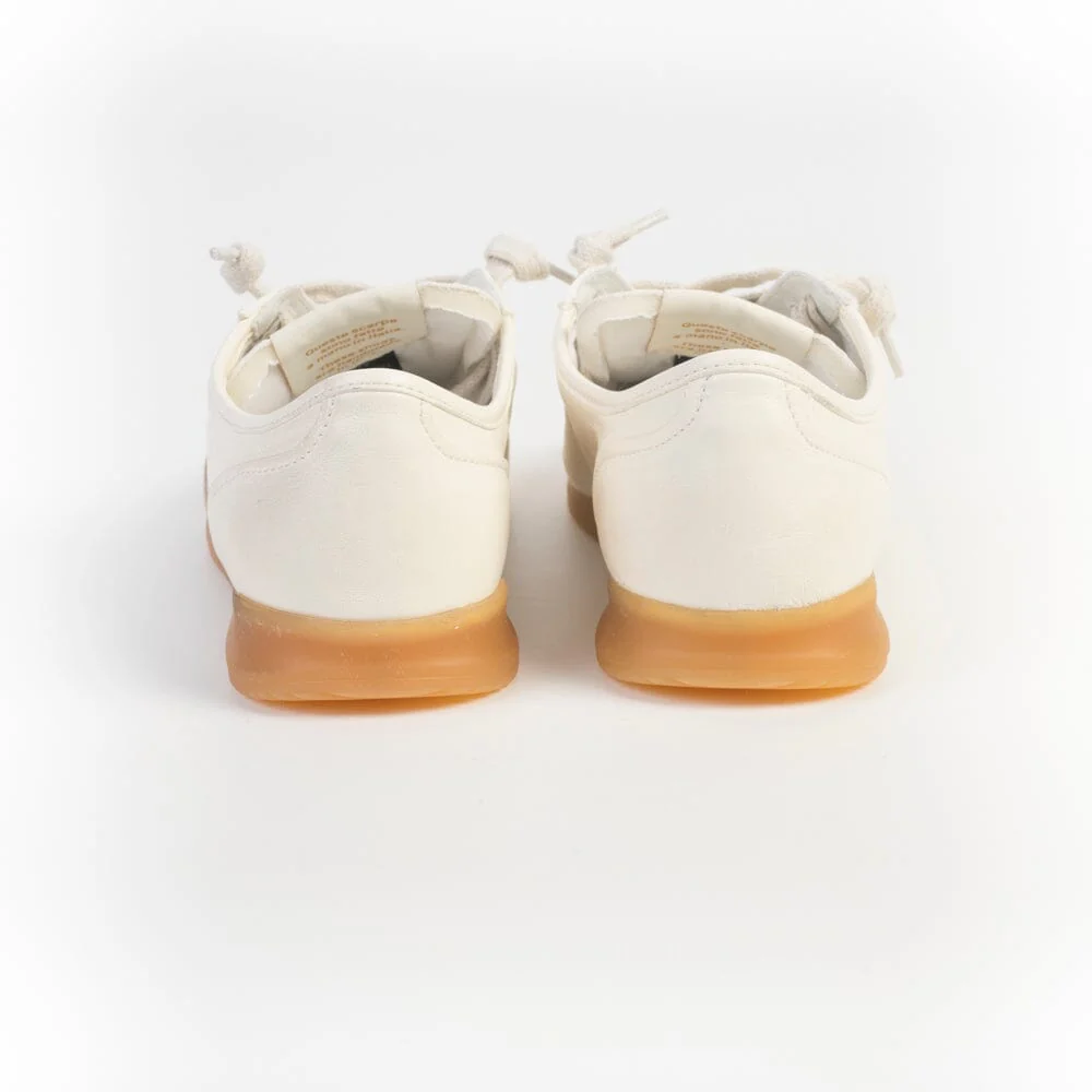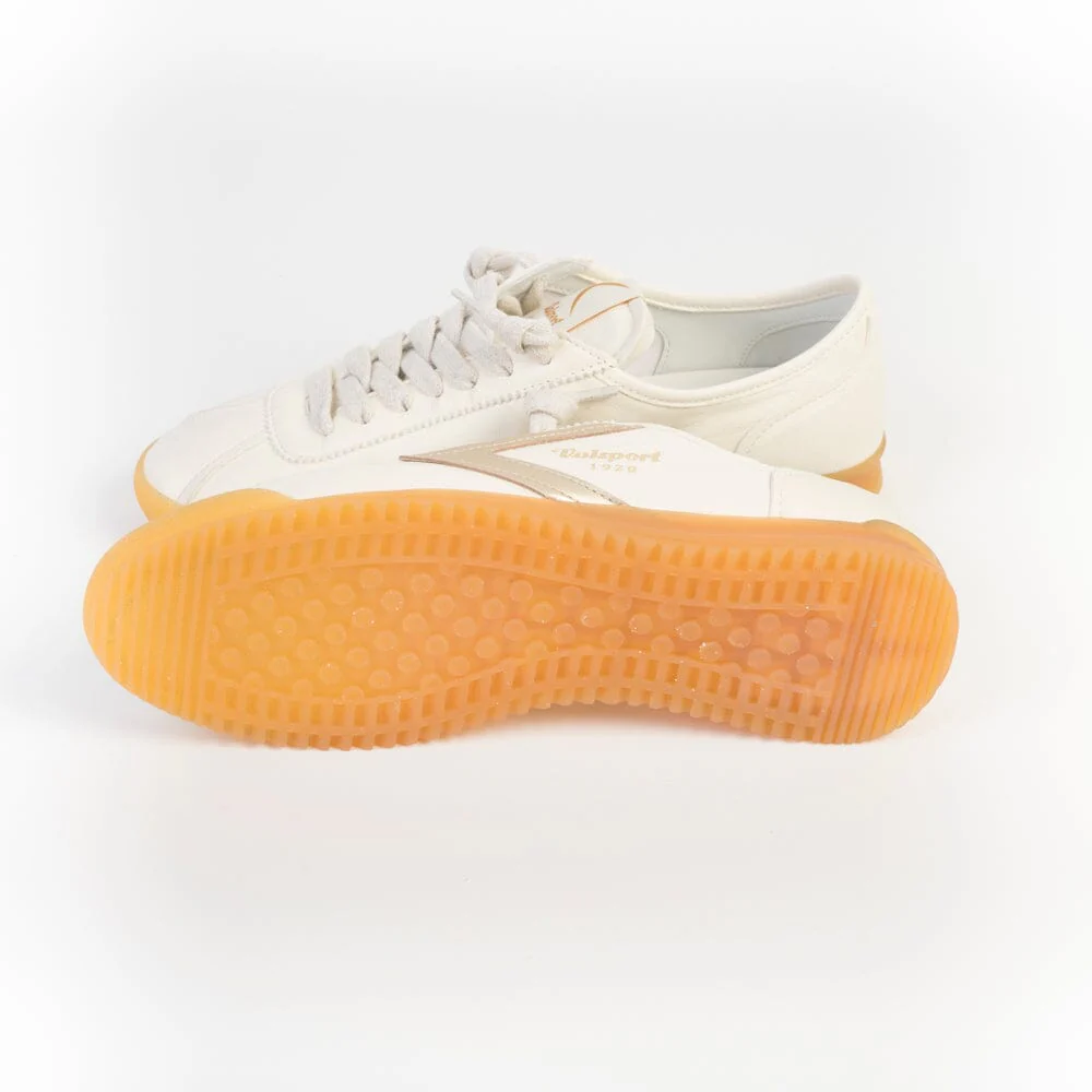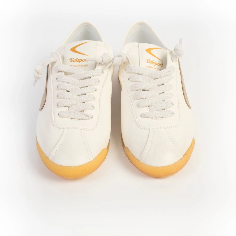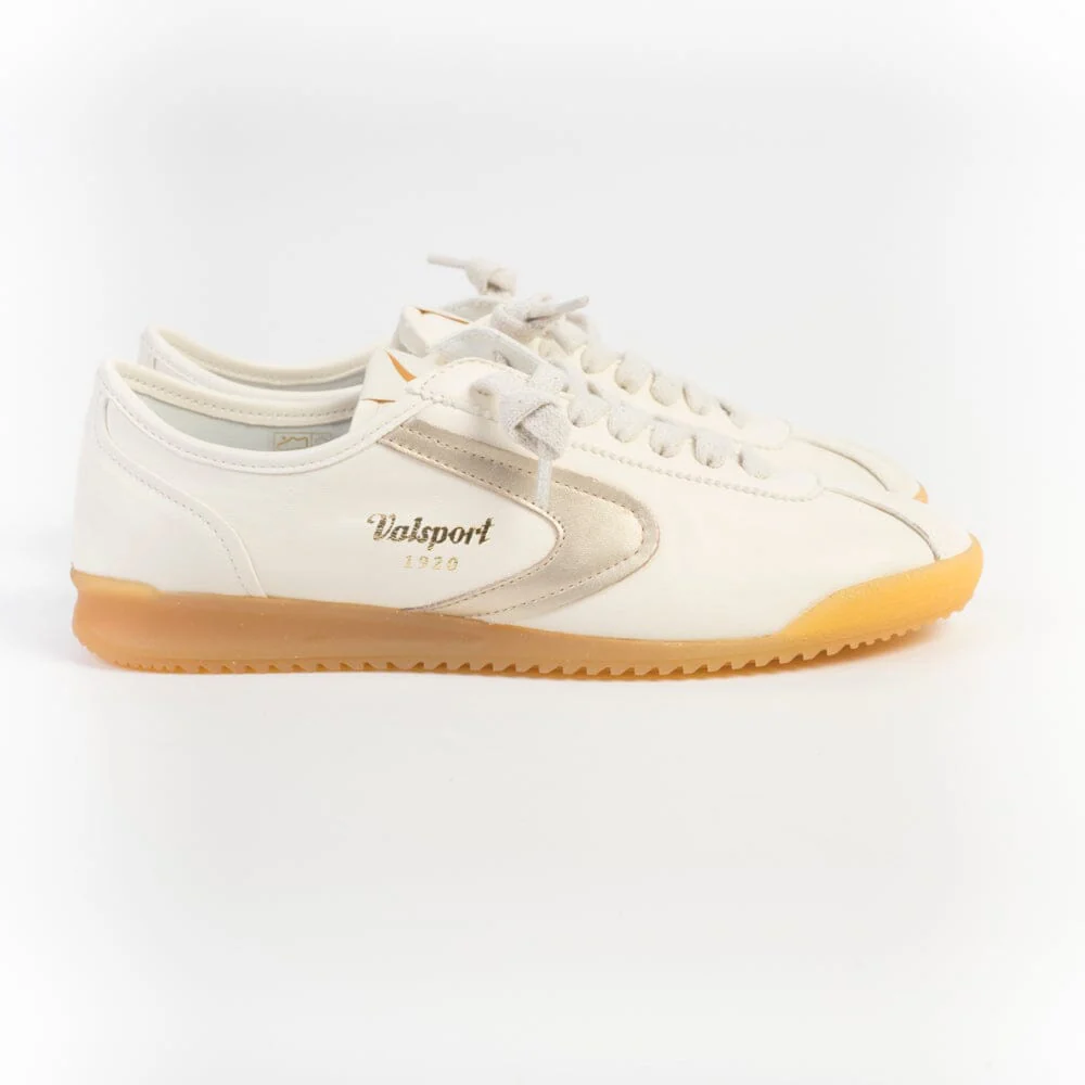 Nuove slim sneakers Epica di Valsport dal gusto retrò realizzate in leggerissima pelle di colore avorio e dettaglio del boomerang laterale in pelle laminata di colore platino. Lacci in cotone di colore bianco. Soletta interna in pelle estraibile di un cm. Suola in gomma naturale.
