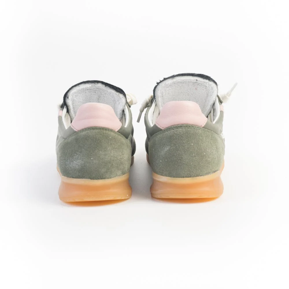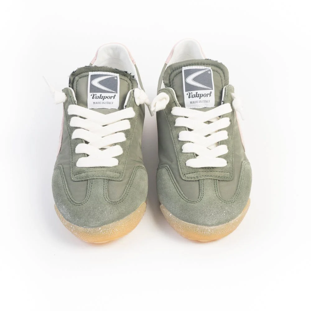 Nuove sneakers Mitica di Valsport dal gusto retrò realizzate in tela vela con effetto invecchiato e camoscio di colore verde salvia con dettagli in morbida nappa di colore rosa cipria. Boomerang laterale in pelle di colore rosa cipria che riprende il tallone. Interno in spugna. Lacci in cotone di colore bianco. Soletta interna in pelle estraibile. Suola in gomma naturale.