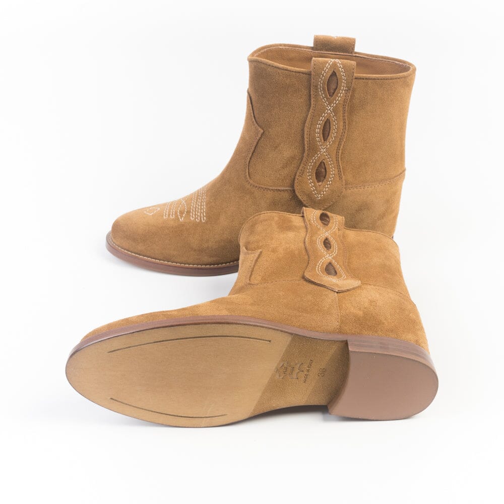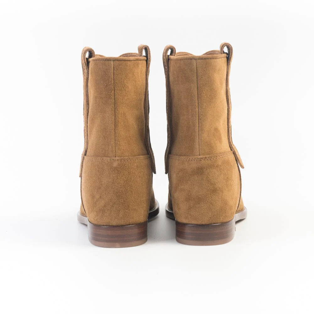 Stivaletto texano di Via Roma 15, realizzato in morbido camoscio di colore cuoio con impuntura in filo di colore beige in contrasto. Decorazione della fascia laterale in camoscio e pelle laminata di colore bronzo. Punta arrotondata, interno in pelle. Zeppa interna di 4 cm e tacco di 2 cm circa. Suola in cuoio. Calzata comoda e regolare.