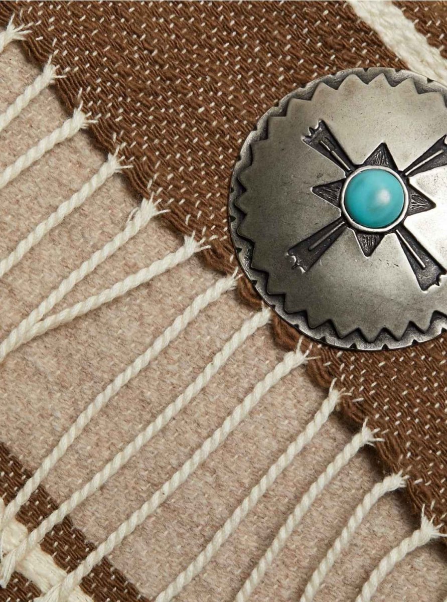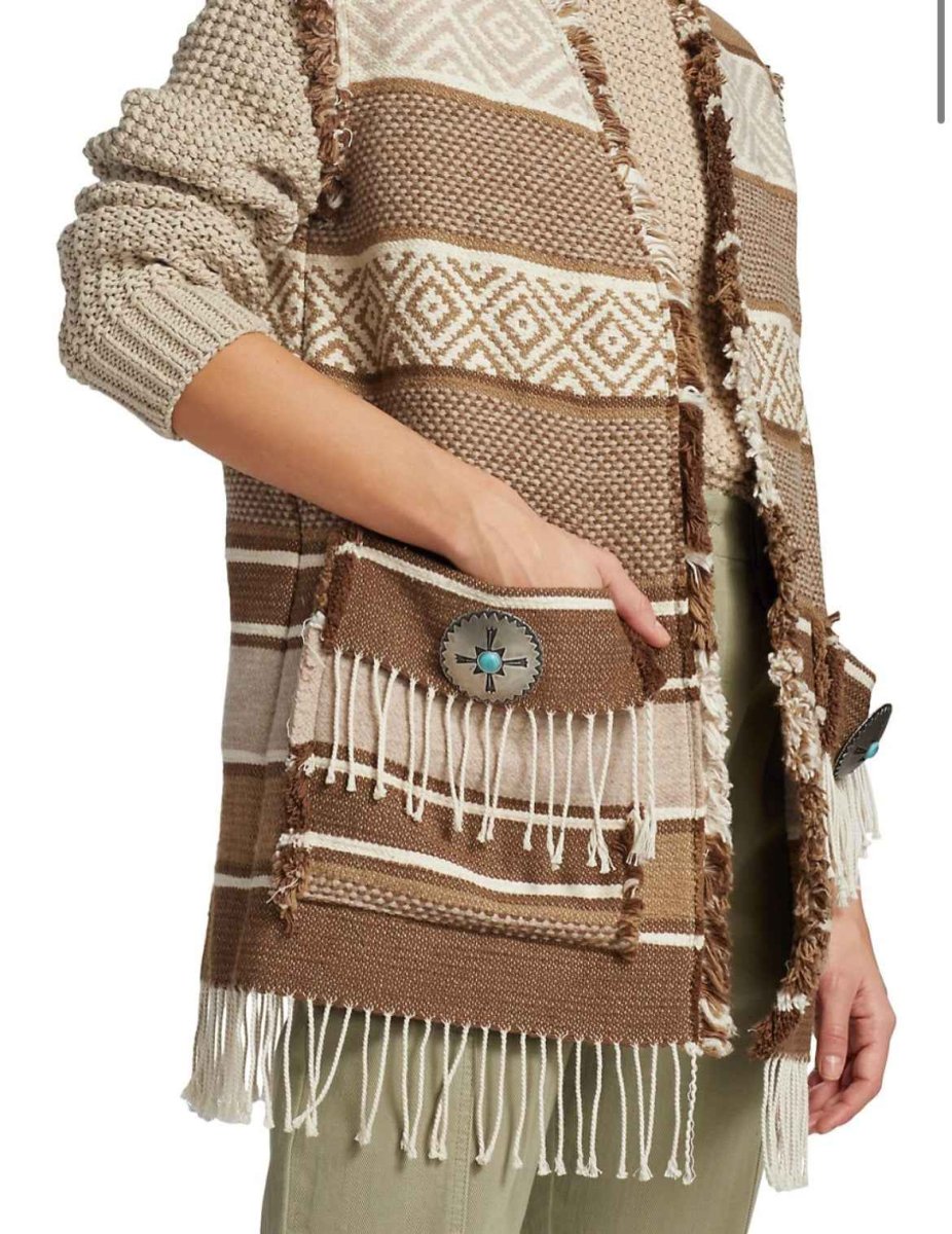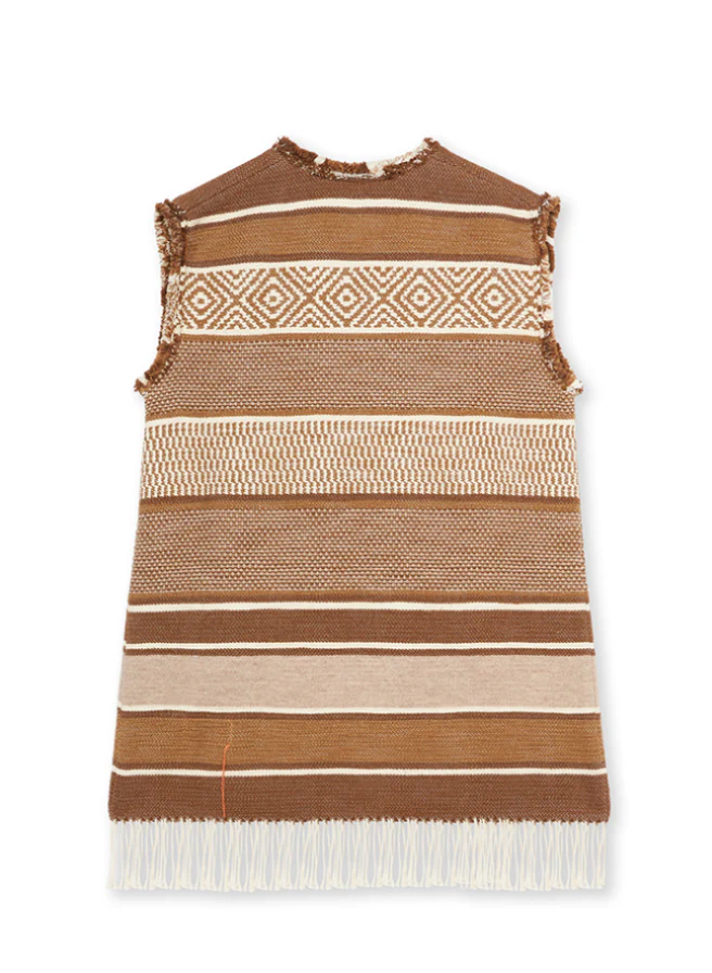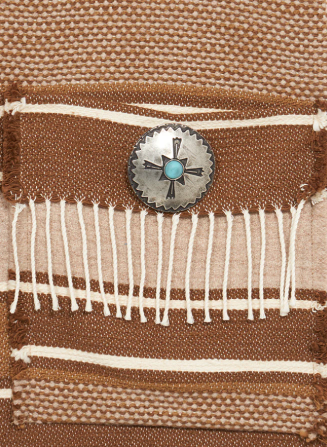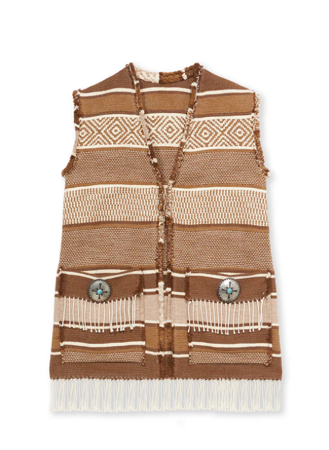 diana cotton-wool blend vest, combining fortela’s ethnic style with a contemporary touch. a color-block panelled design vest with fringe detailing and embellished with metal conchos applied on the front pockets.