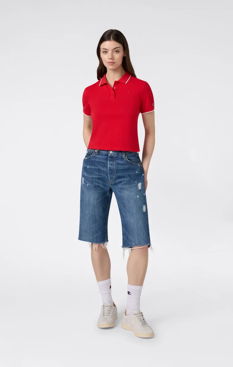 This women’s cropped polo shirt reinterprets a Champion sportswear icon with a contemporary attitude. Made from lightweight cotton piqué, it offers a fresh and comfortable feel, ideal for warmer seasons. The clean design is enhanced by the cropped length and slim fit, which follow the silhouette without feeling restrictive. The polo collar with button placket recalls the brand’s heritage aesthetic, while contrast trims on the collar and sleeves add a distinctive graphic touch. The embroidered Champion logo on the chest completes the look with an authentic detail, making it perfect to pair with denim, track pants or high-waisted skirts for a polished casual style.@@@Slim Fit, close-fitting |Lightweight cotton piqué |Cropped length |Polo collar with button placket |Contrast trims on collar and sleeves |Embroidered Champion logo on the chest |Composition: 100% Cotton |Weight: 195 g/m²