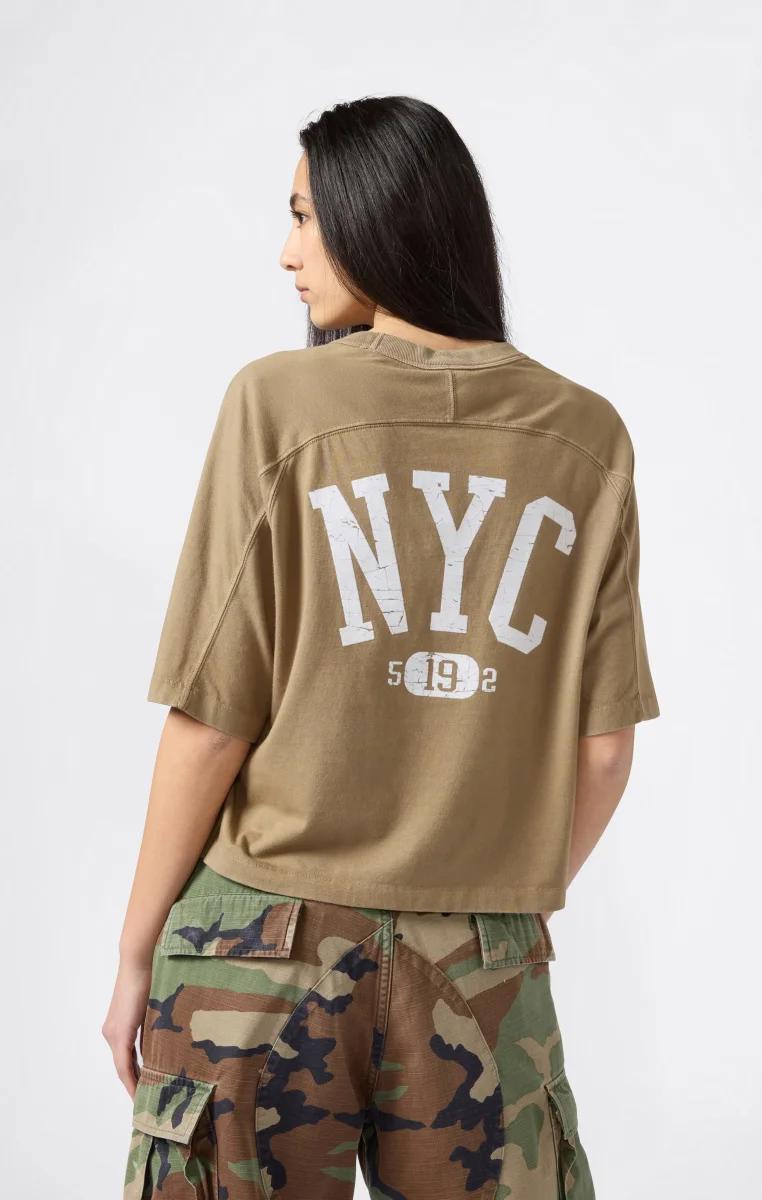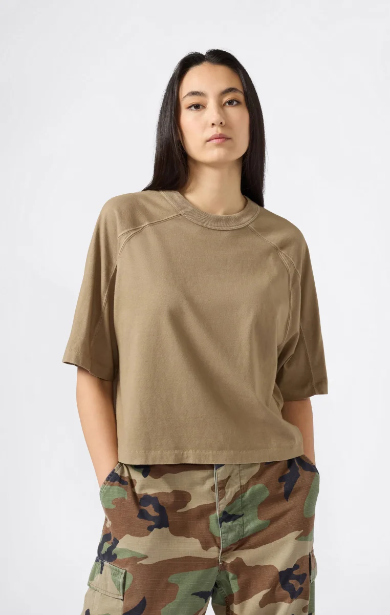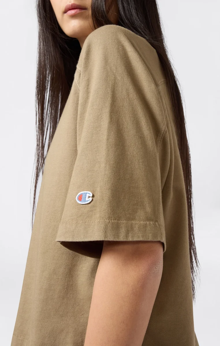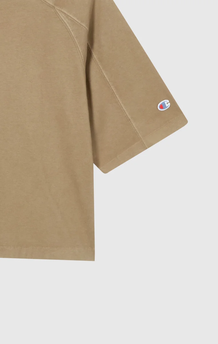 An authentic tribute to American style, this cropped t-shirt from the Time Capsule line reinterprets Champion’s archival graphics with a contemporary flair. The shortened fit and raglan sleeves add a modern touch to the classic crewneck, while the print on the back celebrates the collection’s heritage spirit.@@@Fabric: Compact combed cotton jersey 220 g/m² |Composition: 100% Cotton |Flock graphic on the back |Raglan shoulders |Straight hem and cropped cut |Fit: Standard Fit – versatile and comfortable with standard widths and lengths. Close to the body with simple lines that don’t cling. Regular shoulder cut.