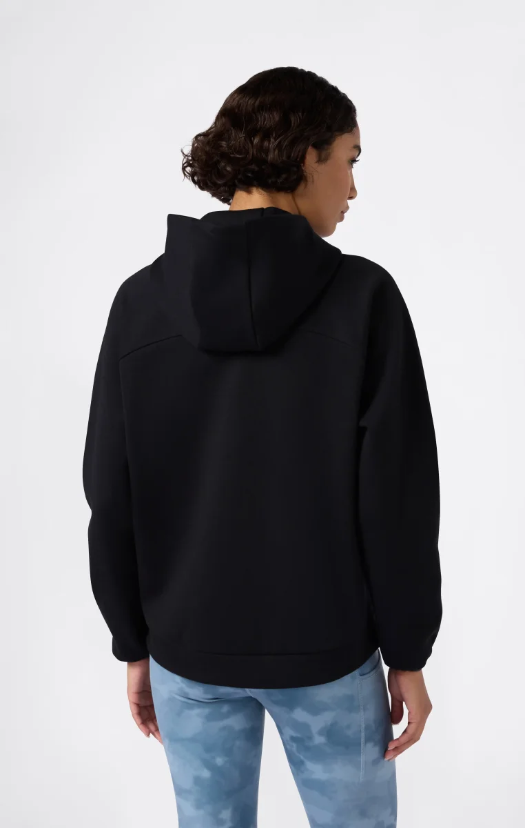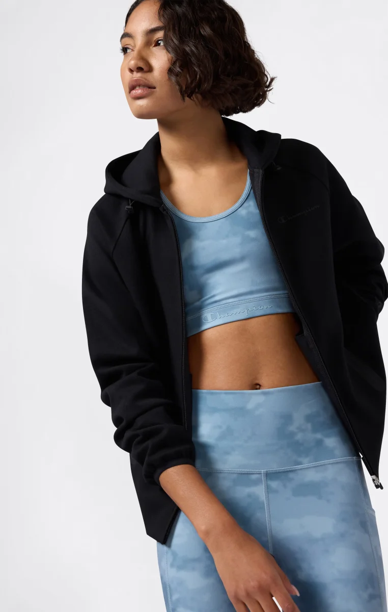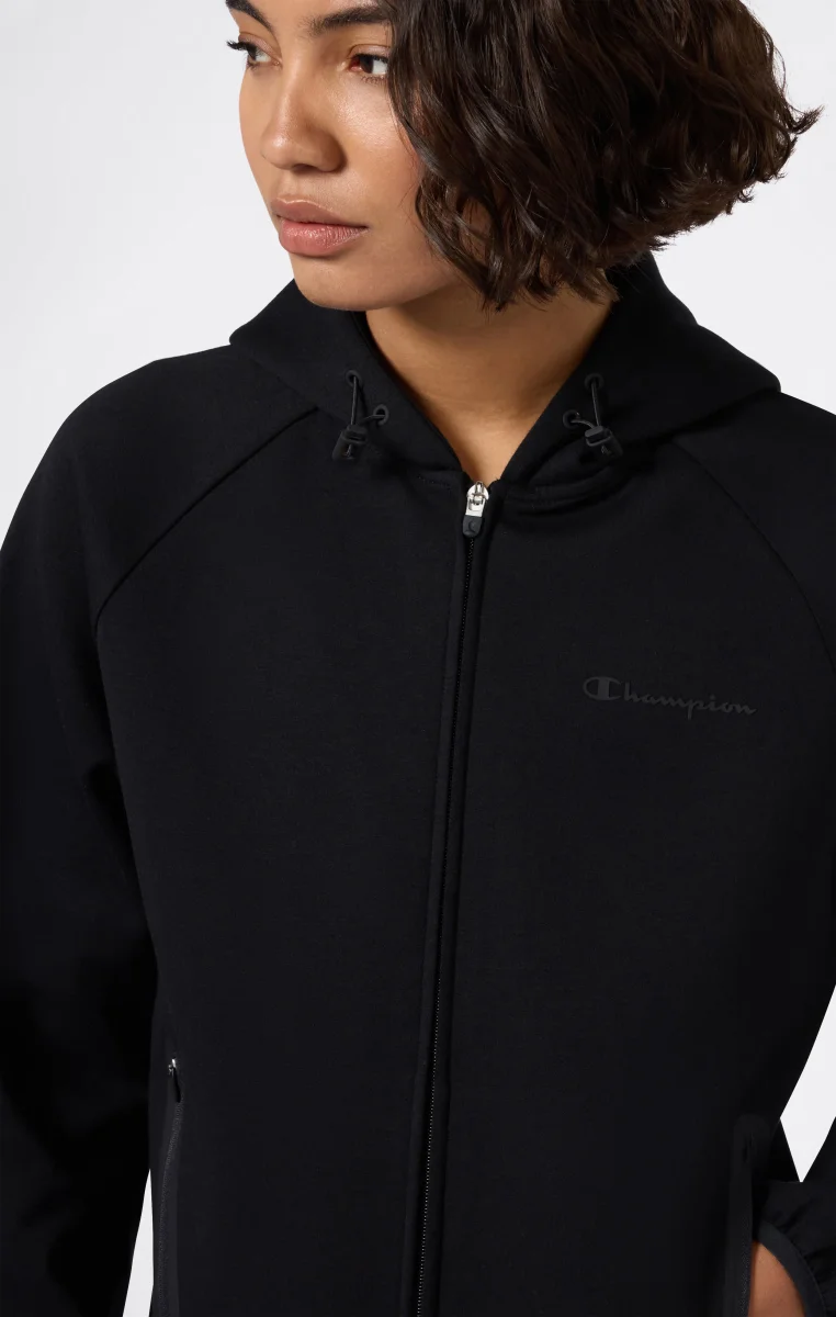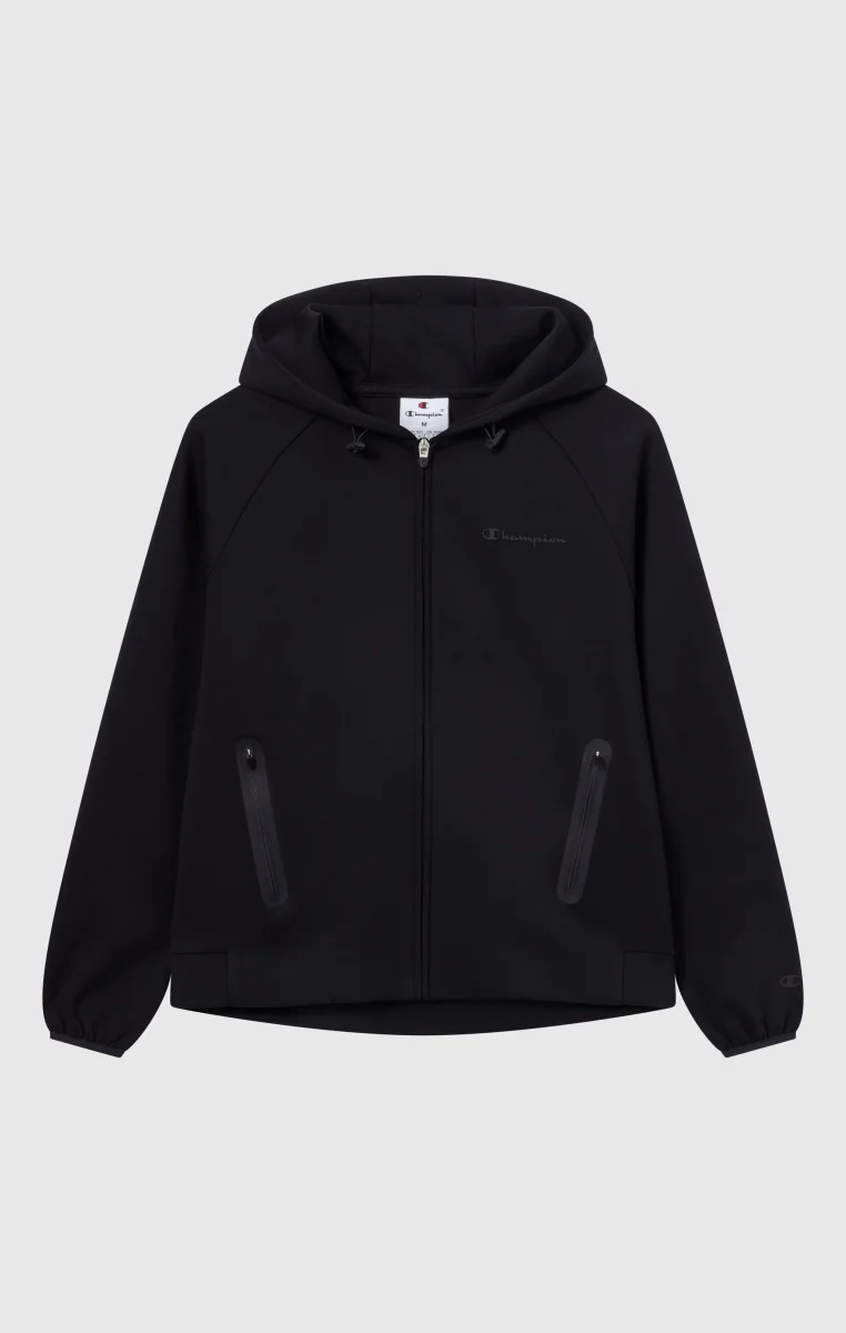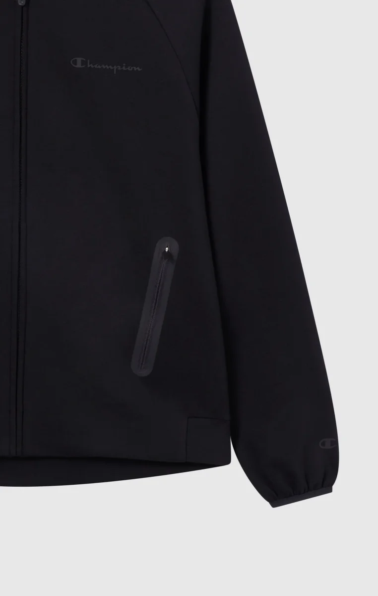 This full-zip hoodie combines comfort and functionality in a clean, versatile design, perfect for tackling dynamic days in the city or light workouts. Made from stretch interlock, it moves with you without restriction. The adjustable hood and thermo-sealed zip pockets add practicality and a technical touch to the look.@@@Fabric: Stretch poly-cotton interlock – 360 g/m² |Composition: 69% Polyester, 26% Cotton, 5% Elastane |Drawstring hood |Heat-sealed zip pockets |Full-zip closure |Tone-on-tone logo on chest |Fit: Standard Fit – versatile and comfortable with standard width and length. Contours the body without clinging. Regular shoulder cut.