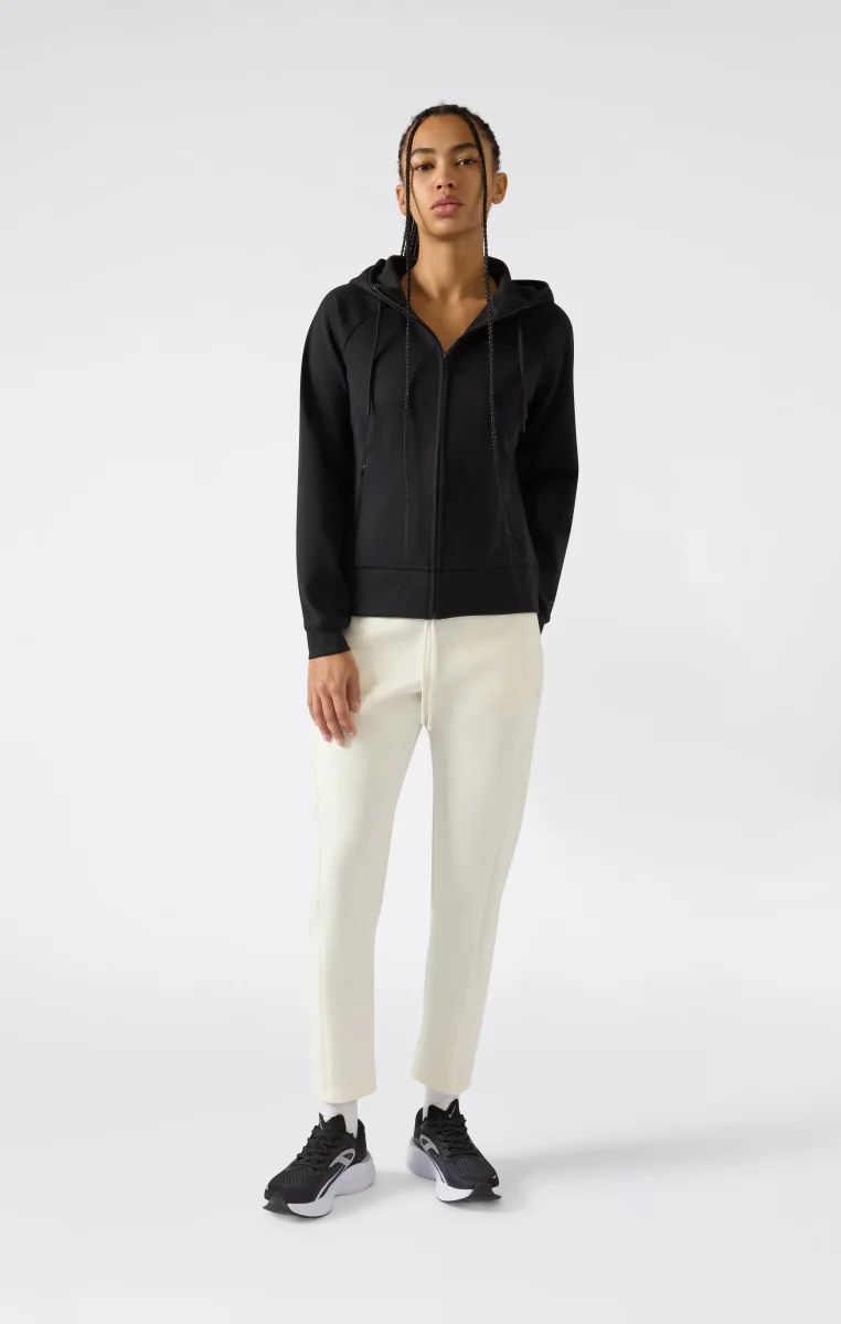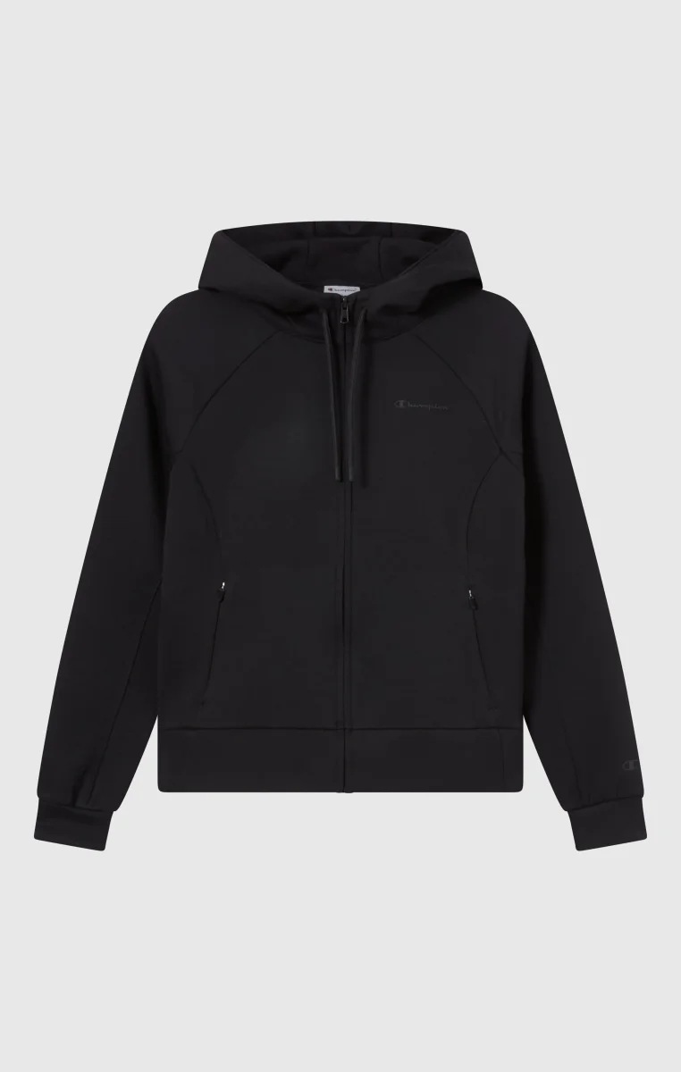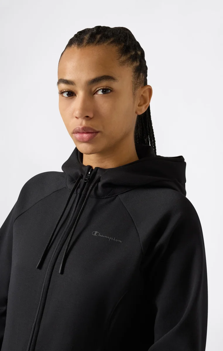 Women’s full zip hoodie with a clean and contemporary sportswear look. Made from stretch interlock fabric in a cotton-poly blend, it offers structure, comfort and flexibility while following the silhouette thanks to the Slim Fit. The raglan sleeve design, adjustable hood and full front zip reflect Champion’s DNA, making it ideal for coordinated outfits and everyday wear.@@@Slim Fit, close-fitting and feminine |Stretch interlock cotton-poly fabric |Composition: 69% Polyester, 26% Cotton, 5% Elastane |Weight: 360 g/m² |Raglan sleeve design |Full zip closure |Adjustable hood with drawstring |Zipped side pockets |Finished cuffs and hem |Tone-on-tone Champion logo on the chest