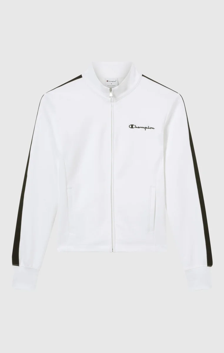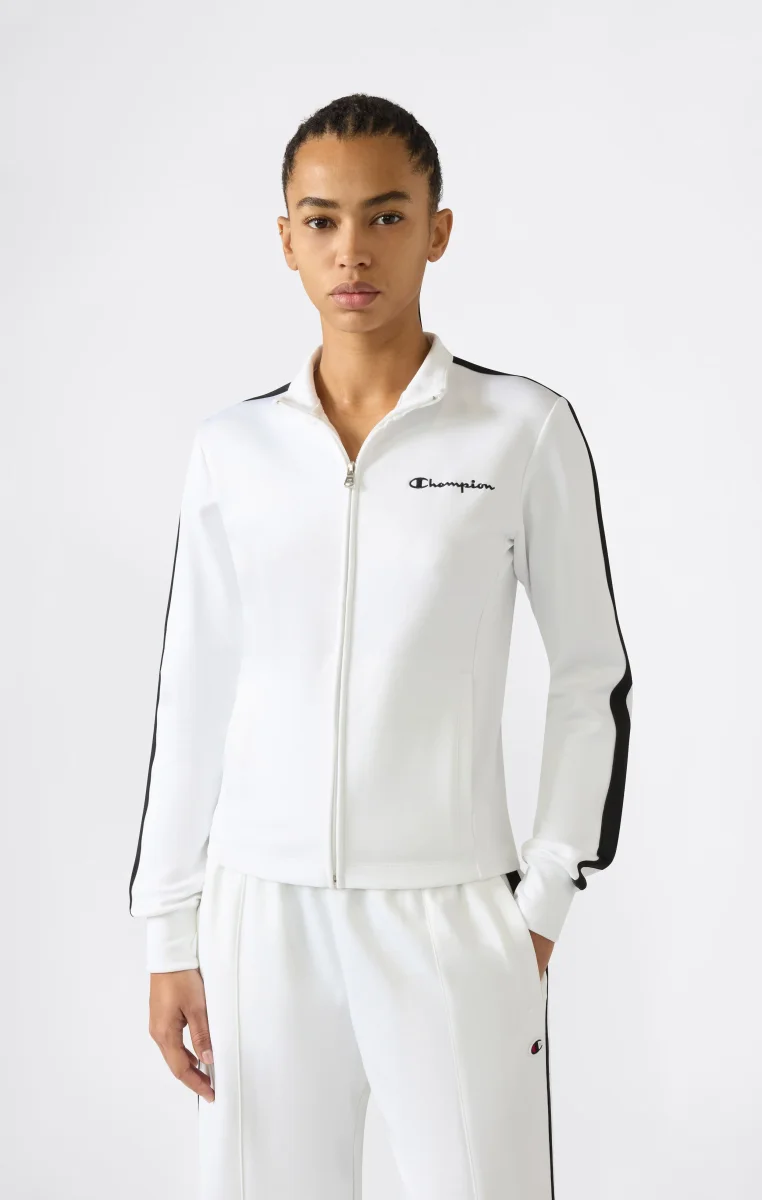 This women’s lightweight track top is designed for everyday movement and comfort. The Shiny & Matt Interlock fabric offers a smooth feel and good stretch, while the contrast Champion logo on the chest adds a clean graphic detail. The Slim fit follows the silhouette without restricting movement, making it ideal for leisure and light activity.@@@Fit: Slim, close-fitting and feminine |Fabric: Shiny & Matt Interlock |Composition: 50% Cotton, 43% Polyester, 7% Elastane |Weight: 265 g/m² |Lightweight track top |Full front zip |Contrast embroidered Champion logo on chest |Unbrushed interior |Front pockets |High collar |Elasticated cuffs and hem