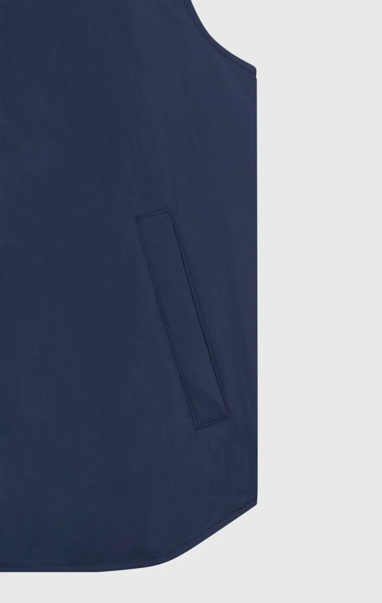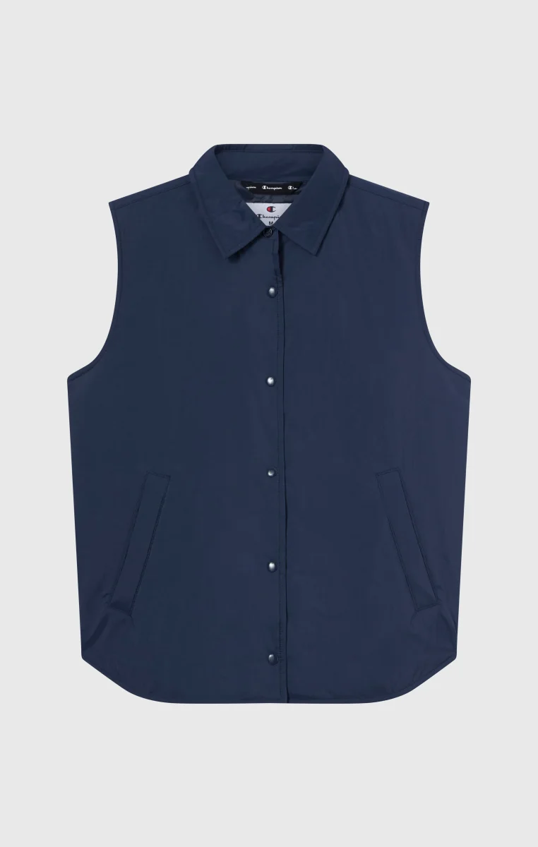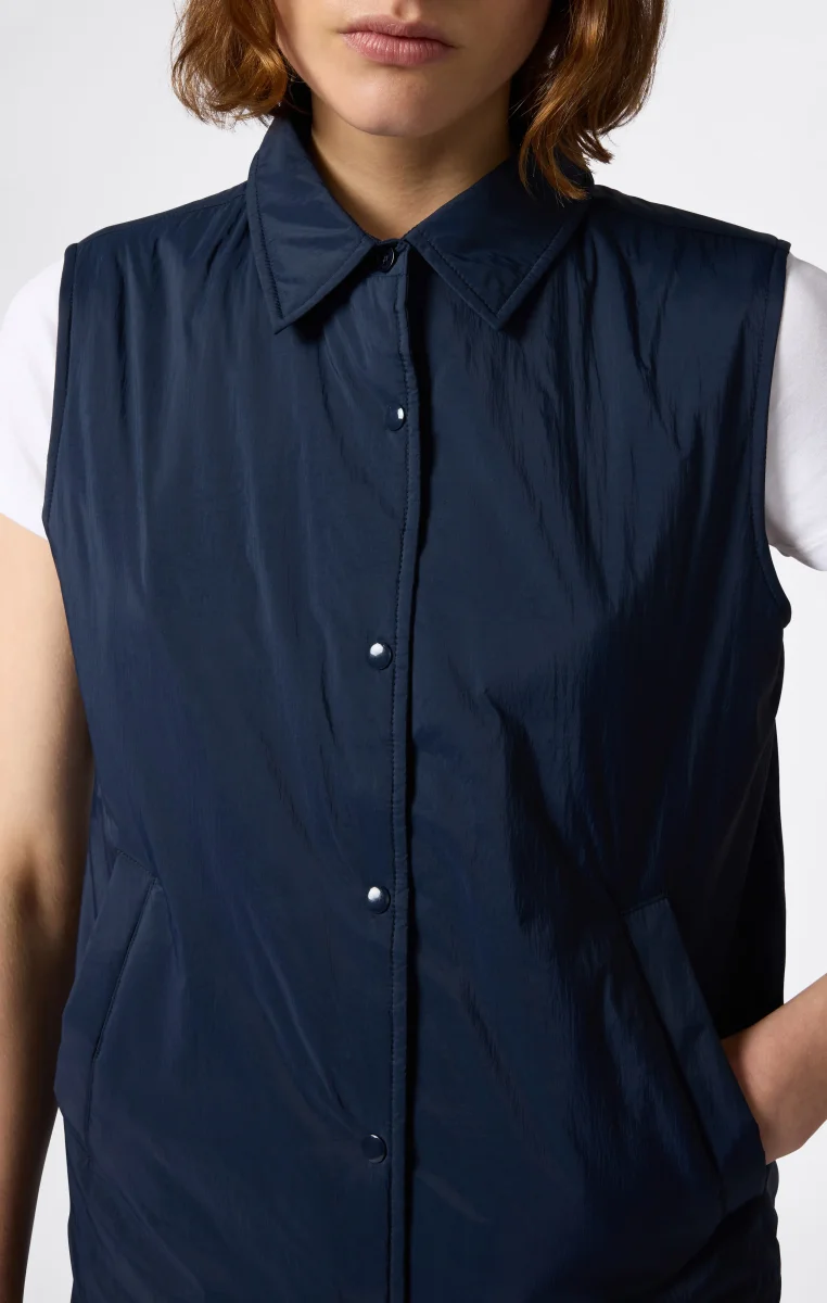 Essential yet distinctive, this vest is ideal to complete your outdoor outfit with lightweight comfort. The nylon fabric with ciré finish and water-repellent treatment protects against light rain, while the snap-button front closure and slanted pockets add functionality. Wear it alone or layered under a jacket for versatile styling.@@@Fabric: Ciré Woven Nylon, weight: 43 g/m² |Composition: 100% Polyamide |Water-repellent treatment |Shirt-style collar |Front snap button closure |Slanted side pockets |Sleeveless |Standard Fit: Versatile and comfortable fit with standard widths and lengths. Close to the body, it has simple lines that do not cling to the shape. Regular shoulder cut.