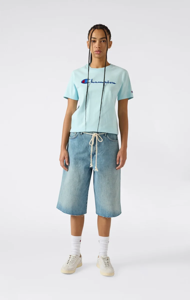 Women’s crewneck T-shirt with a clean, iconic design, made from cotton jersey with Reverse Weave construction. This historic Champion technique uses a cross-grain fabric orientation to enhance durability and help the garment retain its shape over time. The standard fit ensures a balanced, versatile silhouette, while the embroidered Champion script logo on the chest delivers authentic brand heritage, perfect for everyday wear.@@@Standard Fit, regular and comfortable |Cotton jersey fabric |Composition: 100% Cotton |Weight: 200 g/m² |Reverse Weave construction |Crewneck design |Short sleeves |Embroidered Champion script logo on the chest |Champion logo patch on the sleeve