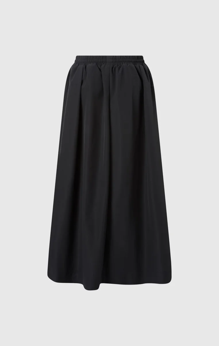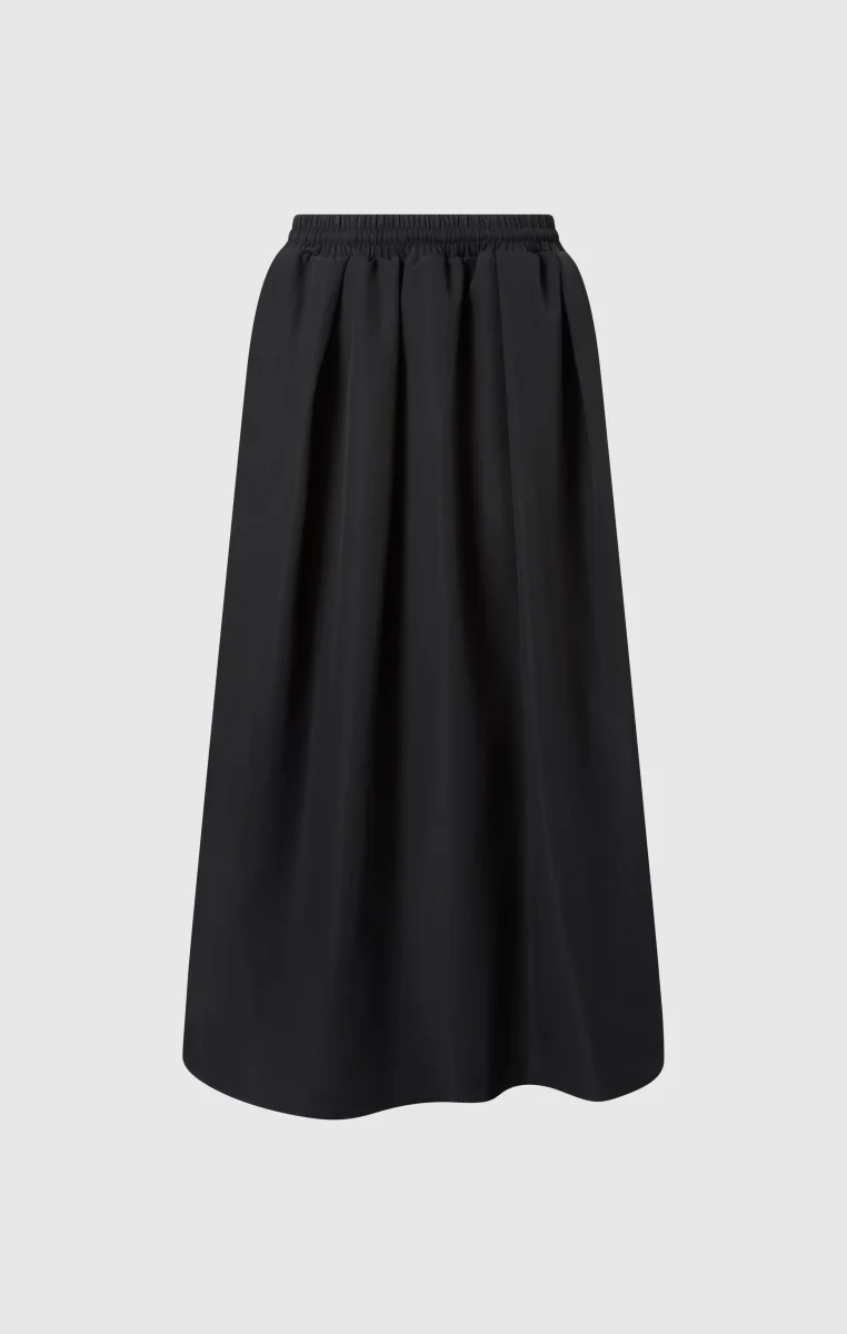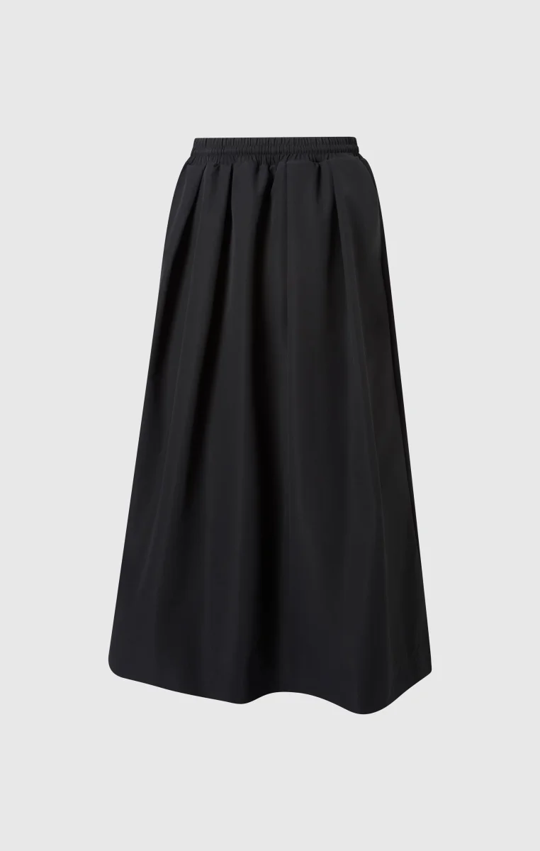This maxi flare skirt is made from 100% polyester fabric with high stretch and a firm, structured feel. It offers functional performance that allows for comfortable wear across a variety of scenes. The flare silhouette is created with front and back tucks, adding natural volume and movement. Simple in design, the skirt is an easy piece to incorporate into a wide range of styling. It features pockets on both sides. The back of the waist is elasticated, and the fit can be adjusted with a drawstring for added comfort. A tonal matte rubber print of the Champion logo is placed above the right hip. A transfer-printed Champion label on the interior is also one of the details that expresses the minimal and refined style of CHAMPION BLACK EDITION.@@@Side Slash Pockets |Waist Drawstring Adjustment |Matt Rubber Print |Transfer Print Name Label |Composition: 100% Polyester |Weight: 140 g/m²