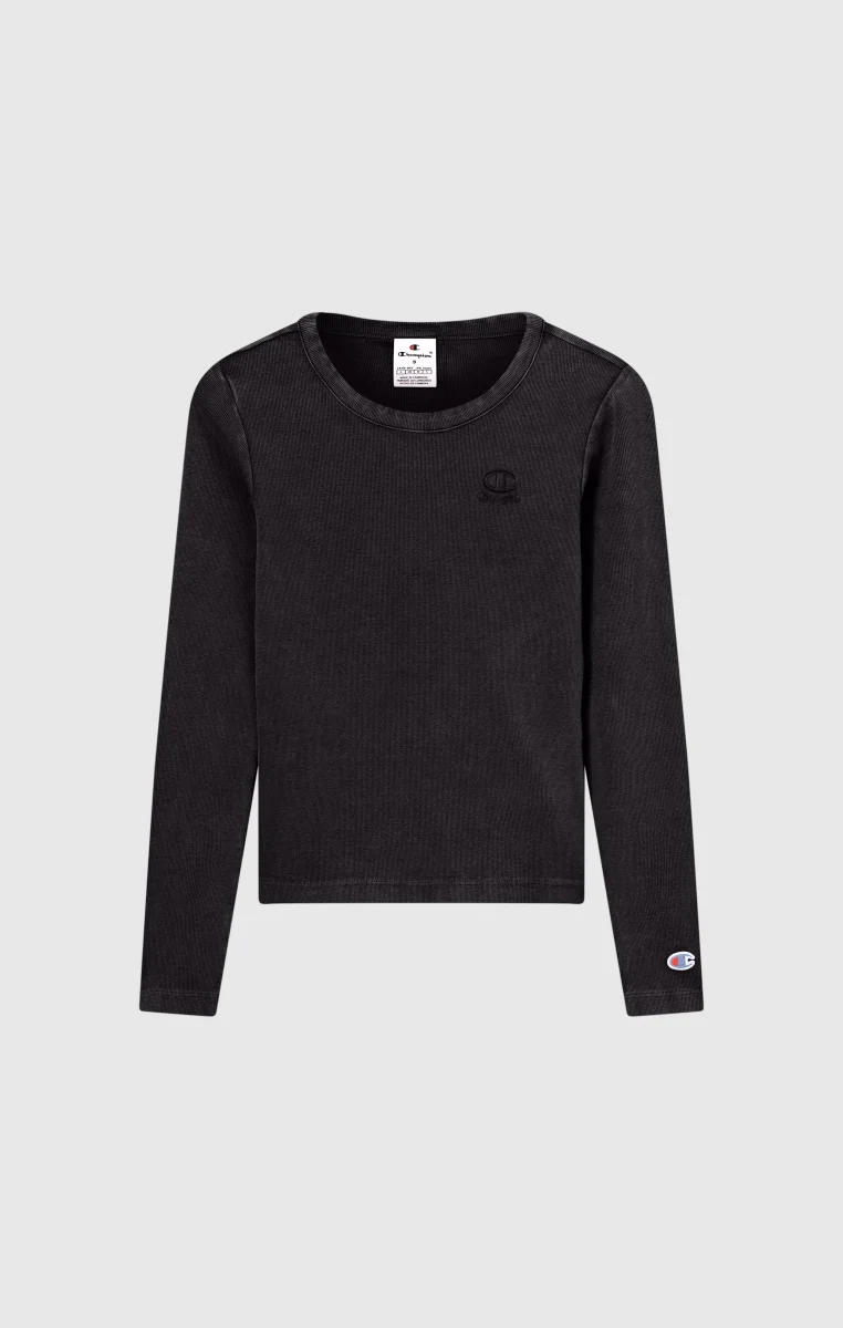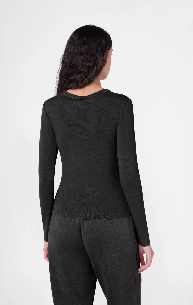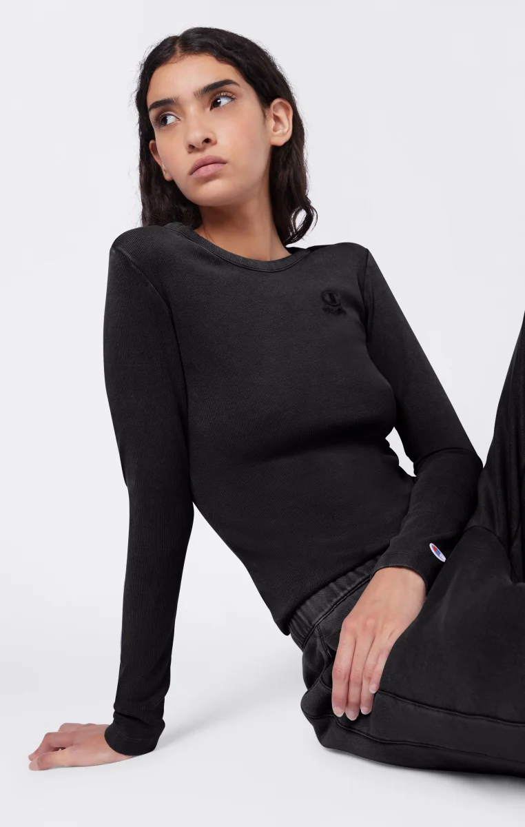 Essential, feminine, with a heritage touch: this long-sleeve t-shirt follows the body’s lines thanks to a fitted cut and elastic ribbed fabric. The washed finish gives it a lived-in look with unique shading and highlighted seams, while the tone-on-tone logo on the chest completes the style with discretion.@@@Fabric: 2×2 ribbed stretch cotton 280 g/m² |Composition: 91% Cotton, 9% Elastane |Washed finish with faded effect |Tone-on-tone embroidered logo on the chest |Fit: Fitted – Slim, body-hugging fit.