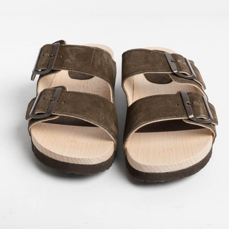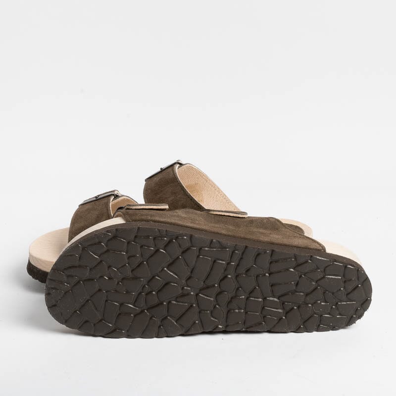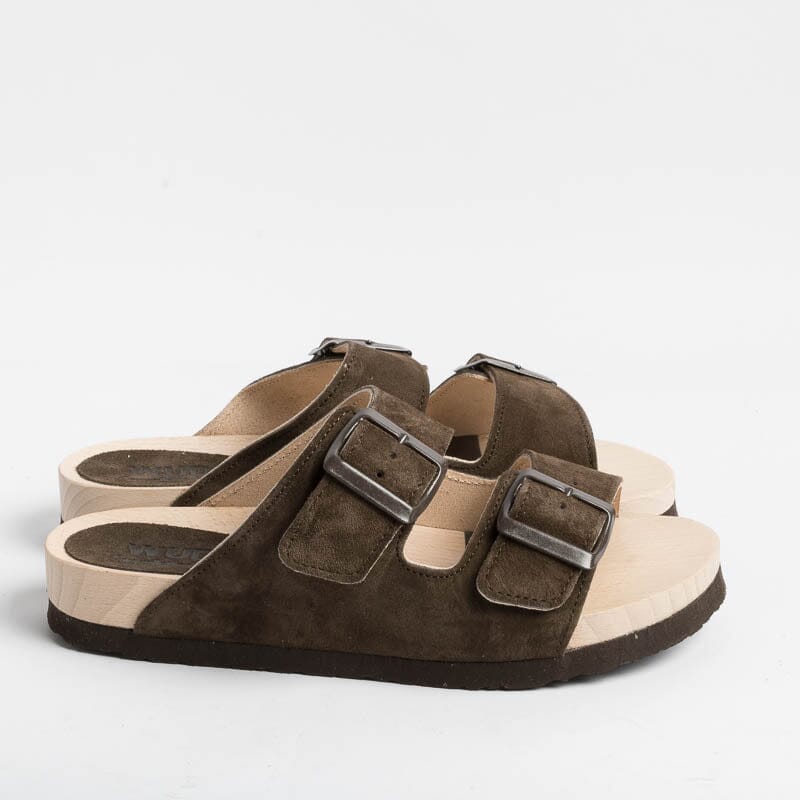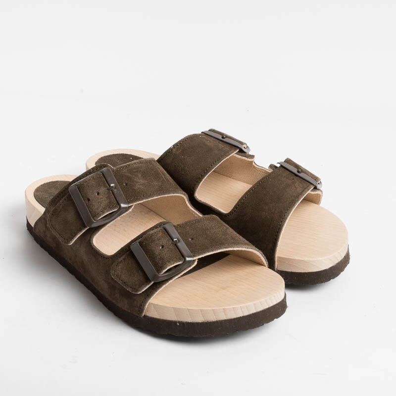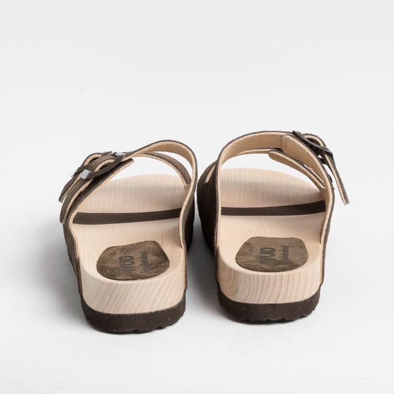 Ciabatta di WUD a doppia fascia con fibbie regolabili in camoscio di colore testa di moro, realizzata totalmente in materiale riciclato. Attraverso l’innovativa formula Evolo, gli scarti di produzione del pellame vengono rilavorati e riacquistano una seconda vita. Il sottopiede è realizzato in legno certificato, cresciuto in foreste gestite in modo sostenibile. La gomma della sottosuola è realizzata con il 60% di materiali riciclati.