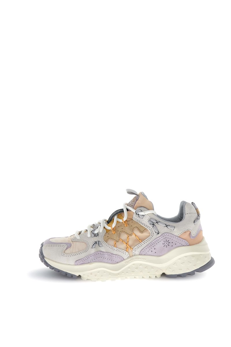 Sneaker in tessuto tecnico con inserti in suede multicolor. Occhielli rinforzati e lacci trek. Soletta interna in sughero naturale antibatterico, fondo in gomma ultra leggera con battistrada dentellato.